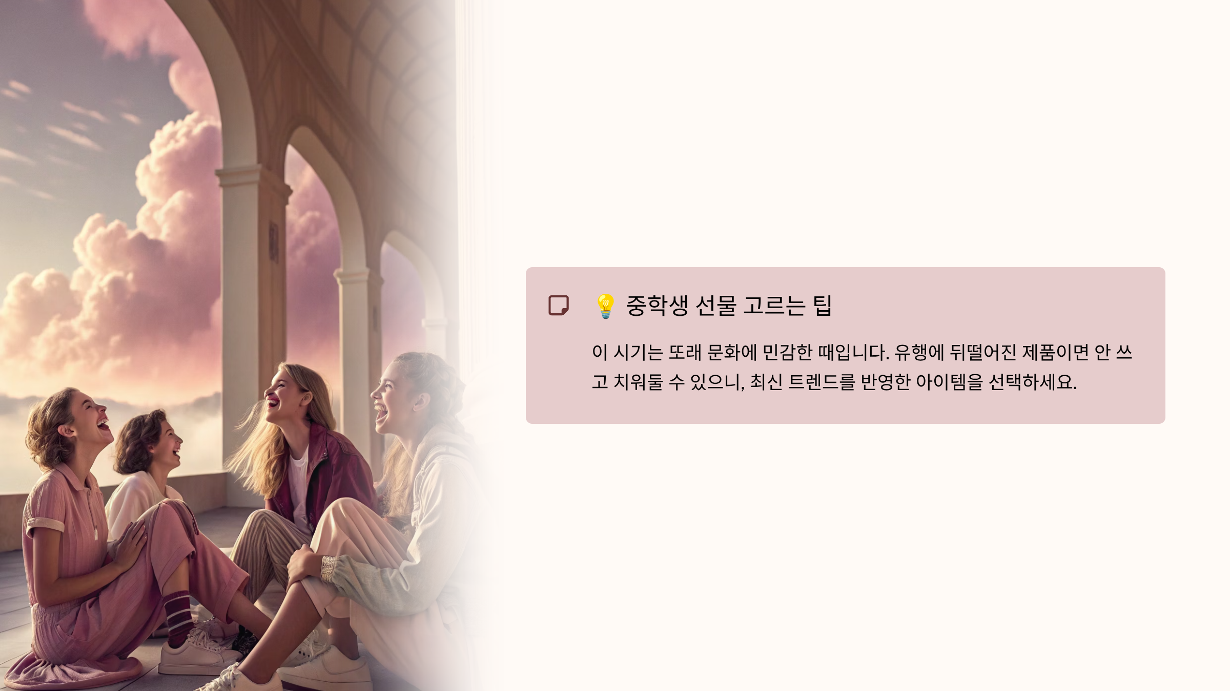 이 시기는 또래 문화에 민감한 때입니다. 유행에 뒤떨어진 제품이면 안 쓰고 치워둘 수 있으니, 최신 트렌드를 반영한 아이템을 선택하세요.