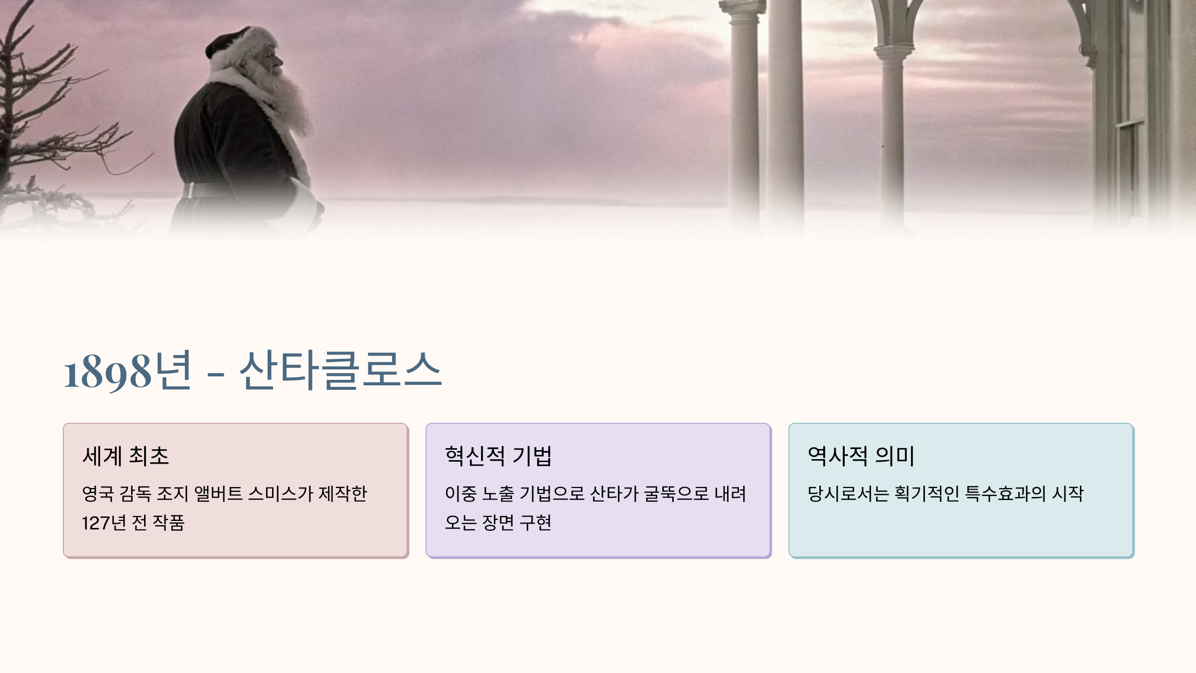 공식적으로 기록된 세계 최초의 크리스마스 영화는 영국 감독 조지 앨버트 스미스(George Albert Smith)가 제작한 1898년 작품 "산타클로스(Santa Claus)"입니다! 무려 127년 전의 작품이에요. 이 영화는 이중 노출 기법(double-exposure techniques)을 사용해서 산타클로스가 굴뚝으로 내려오고, 아이들의 양말 속에 선물을 몰래 넣는 장면을 담았습니다. 당시로서는 정말 획기적인 특수효과였죠!