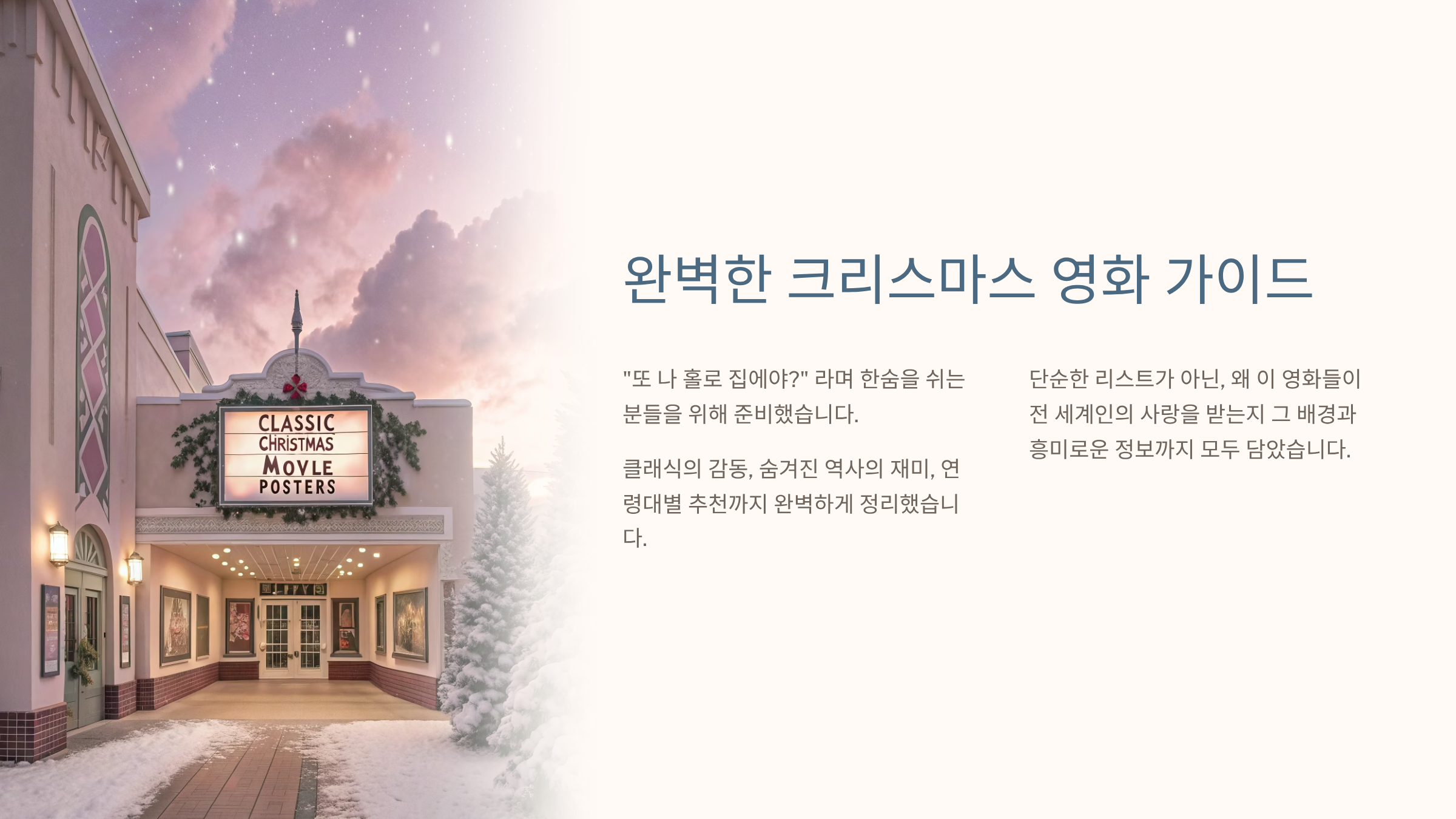 "아, 또 나 홀로 집에야?" 라며 한숨을 쉬는 분들 계시나요? 이번에는 제가 직접! 클래식의 감동, 숨겨진 역사의 재미, 그리고 연령대별로 즐길 수 있는 크리스마스 영화 추천 완벽 가이드를 준비했습니다. 단순히 영화 리스트만 나열하는 게 아니라, 왜 이 영화들이 전 세계인의 사랑을 받는지, 그 배경과 흥미로운 정보까지 싹 다 정리해봤으니 끝까지 따라와 주세요! 😊