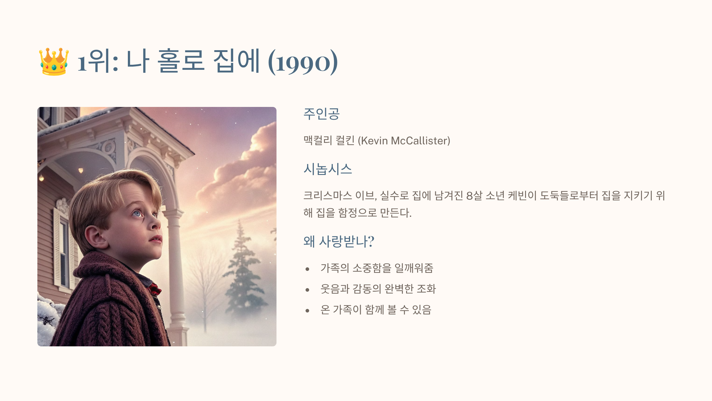 | 한국 | "나 홀로 집에" (1990) | 가족 코미디 | 세대를 아우르는 클래식 |