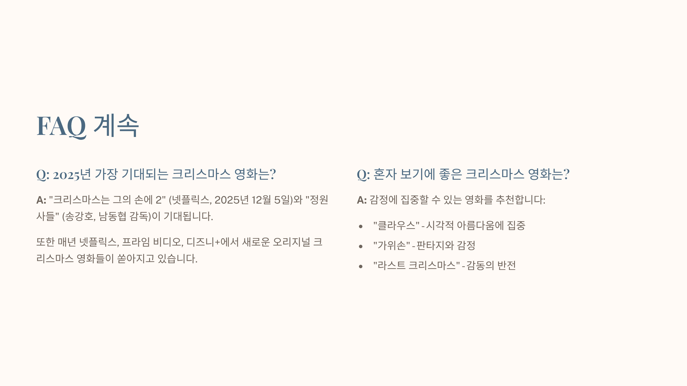 A: "크리스마스는 그의 손에 2" (넷플릭스, 2025년 12월 5일)와 "정원사들" (송강호, 남동협 감독)이 기대됩니다. 또한 매년 넷플릭스, 프라임 비디오, 디즈니+에서 새로운 오리지널 크리스마스 영화들이 쏟아지고 있습니다.