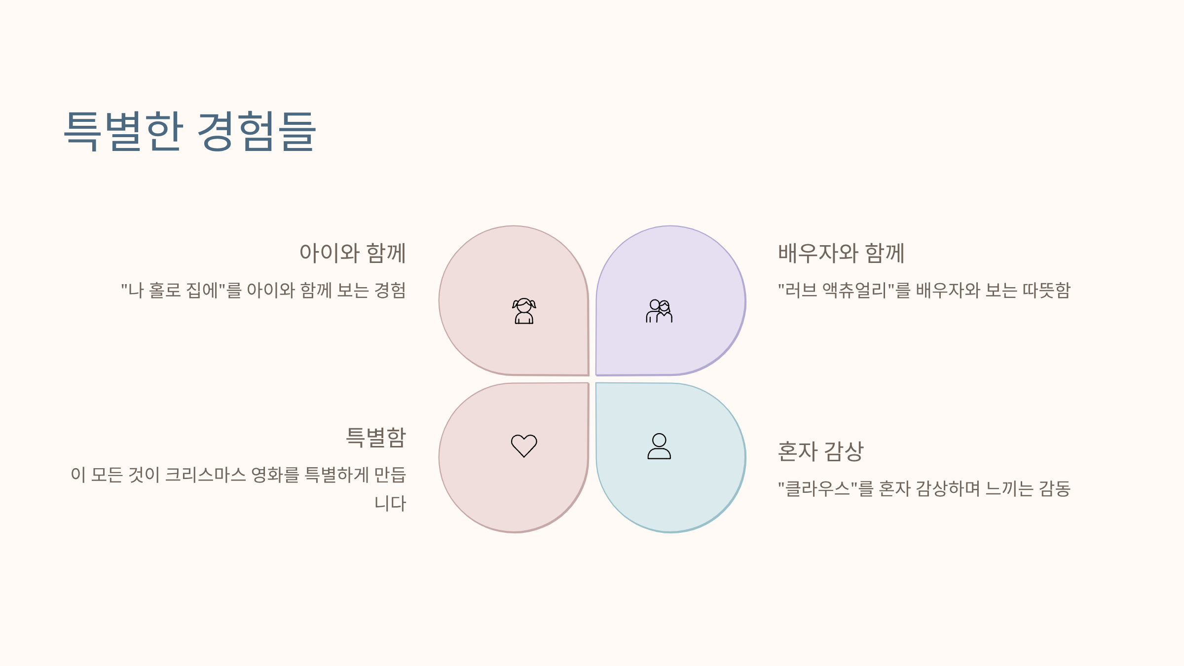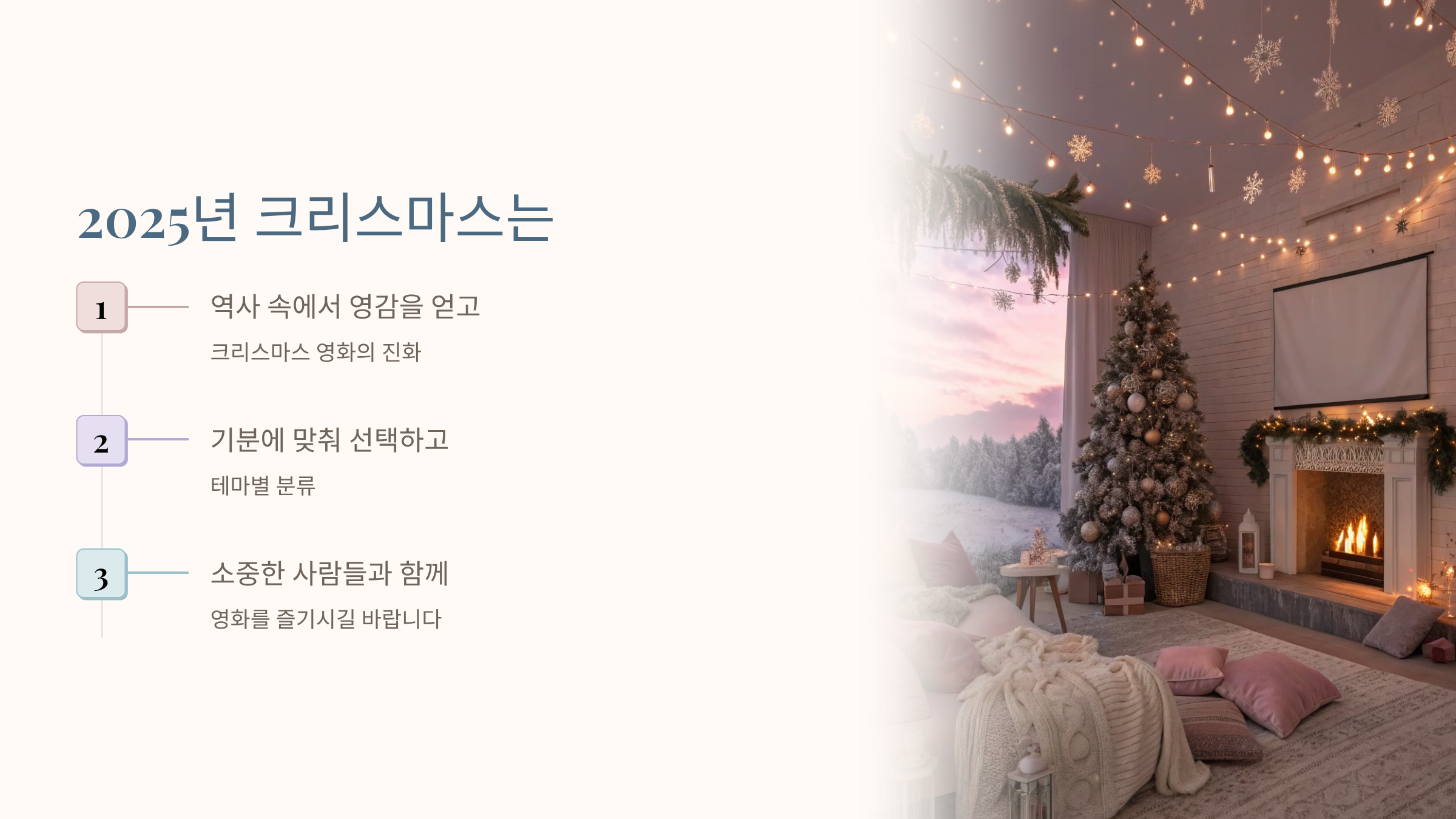 "나 홀로 집에"를 아이와 함께 보는 경험, "러브 액츄얼리"를 배우자와 보는 따뜻함, "클라우스"를 혼자 감상하며 느끼는 감동 — 이 모든 것이 크리스마스 영화를 특별하게 만듭니다.