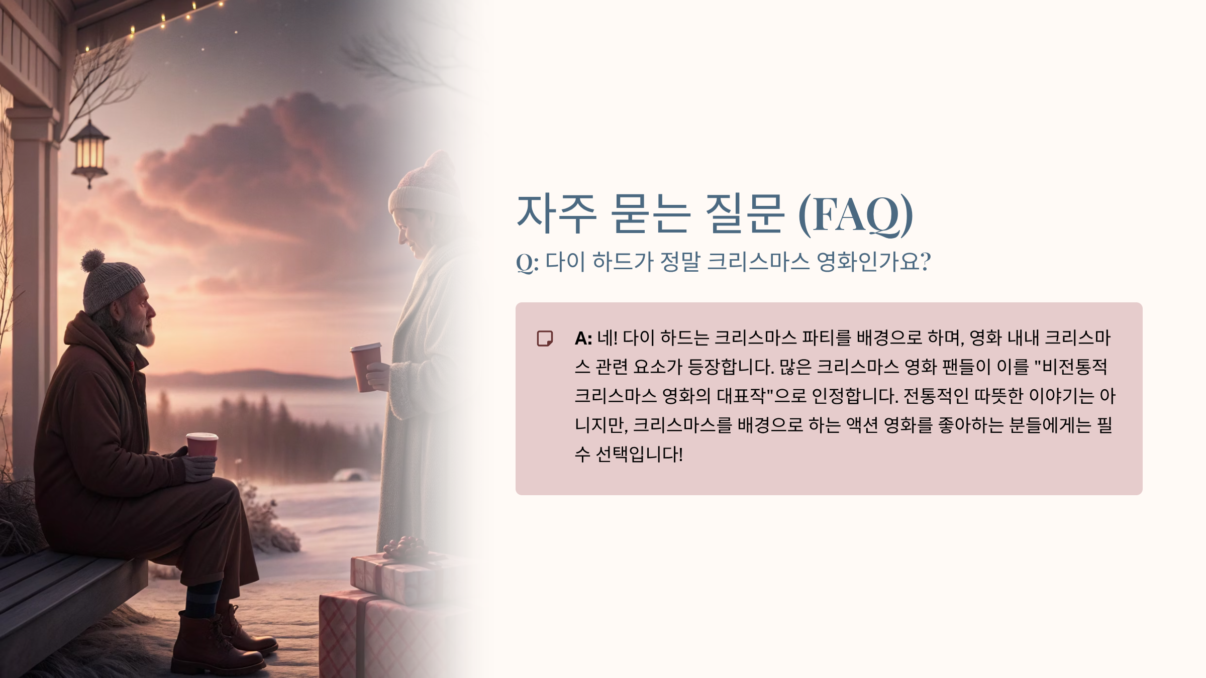 A: 네! 다이 하드는 크리스마스 파티를 배경으로 하며, 영화 내내 크리스마스 관련 요소가 등장합니다. 많은 크리스마스 영화 팬들이 이를 "비전통적 크리스마스 영화의 대표작"으로 인정합니다. 전통적인 따뜻한 이야기는 아니지만, 크리스마스를 배경으로 하는 액션 영화를 좋아하는 분들에게는 필수 선택입니다!