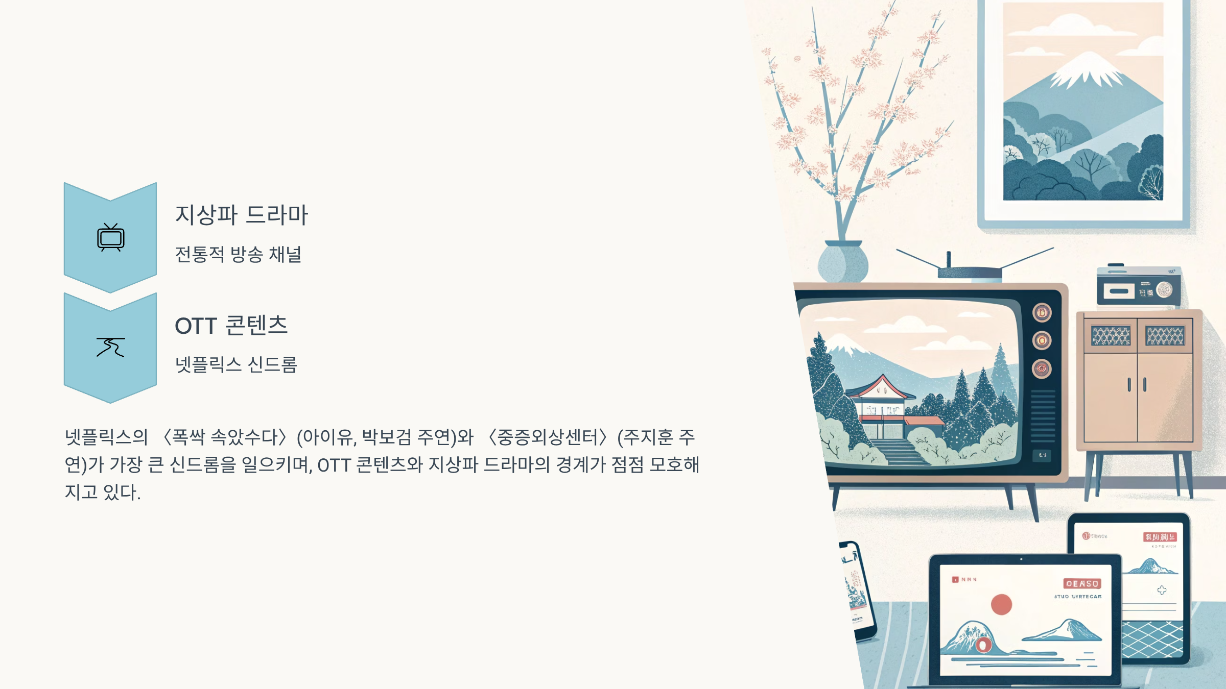 넷플릭스의 〈폭싹 속았수다〉(아이유, 박보검 주연)와 〈중증외상센터〉(주지훈 주연)가 가장 큰 신드롬을 일으키며, OTT 콘텐츠와 지상파 드라마의 경계가 점점 모호해지고 있다.