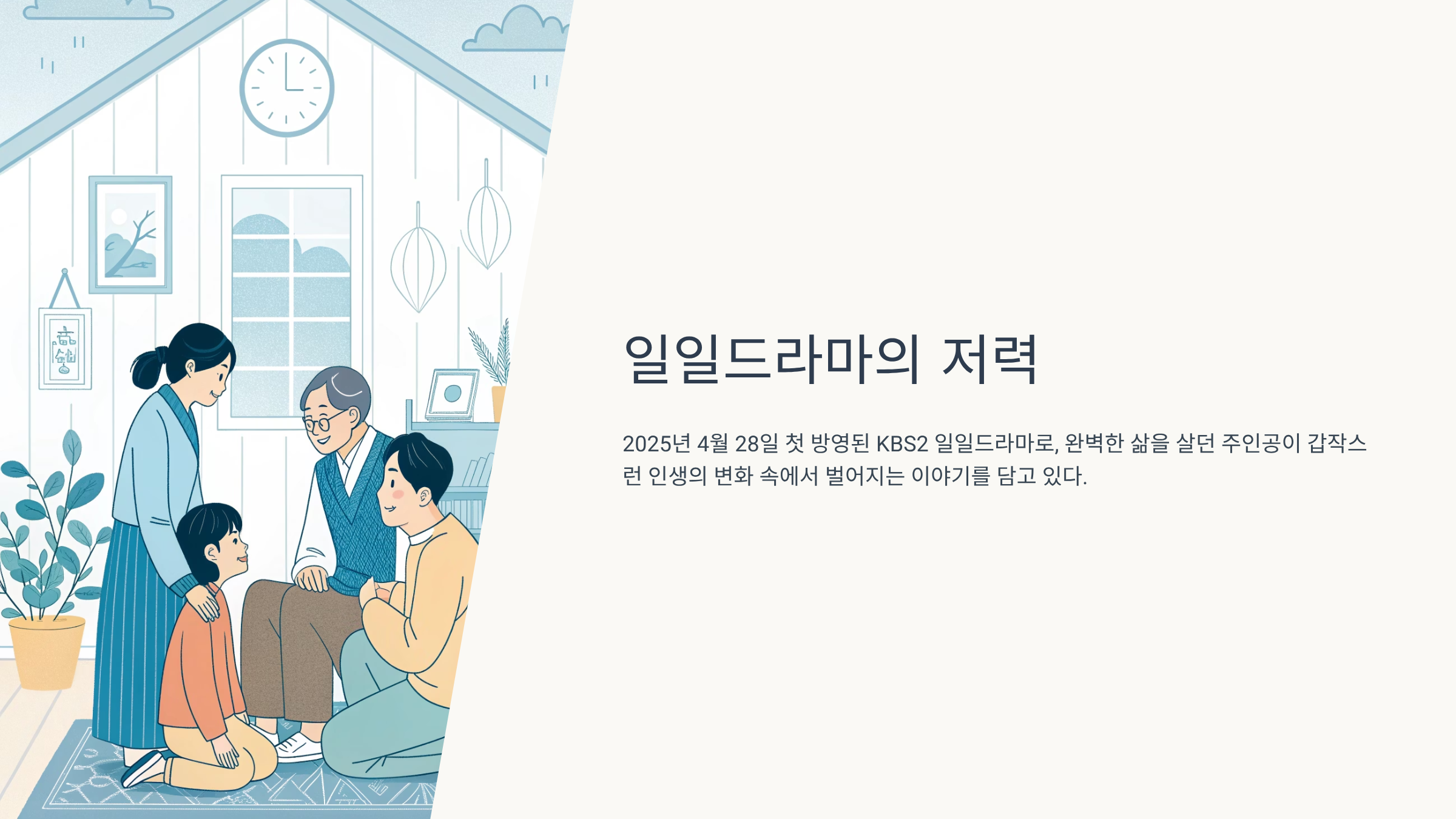 2025년 4월 28일 첫 방영된 KBS2 일일드라마로, 완벽한 삶을 살던 주인공이 갑작스런 인생의 변화 속에서 벌어지는 이야기를 담고 있다.