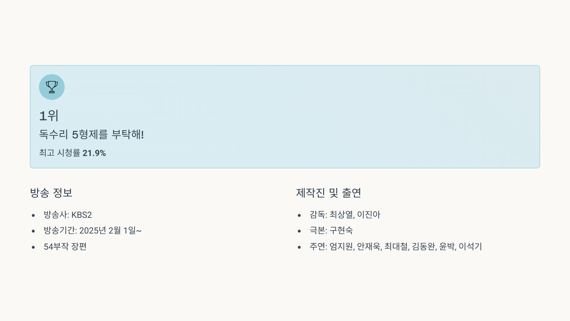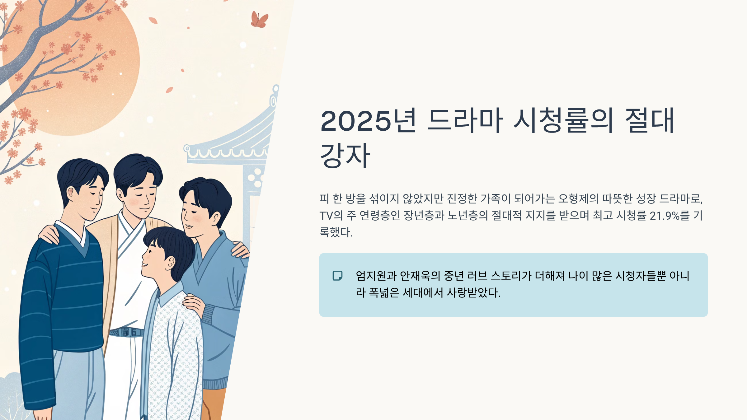 2025년 드라마 시청률의 절대 강자는 단연 〈독수리 5형제를 부탁해!〉다. 이 작품은 피 한 방울 섞이지 않았지만 진정한 가족이 되어가는 오형제의 따뜻한 성장 드라마로, TV의 주 연령층인 장년층과 노년층의 절대적 지지를 받으며 최고 시청률 21.9%를 기록했다. 엄지원과 안재욱의 중년 러브 스토리가 더해져 나이 많은 시청자들뿐 아니라 폭넓은 세대에서 사랑받았다.