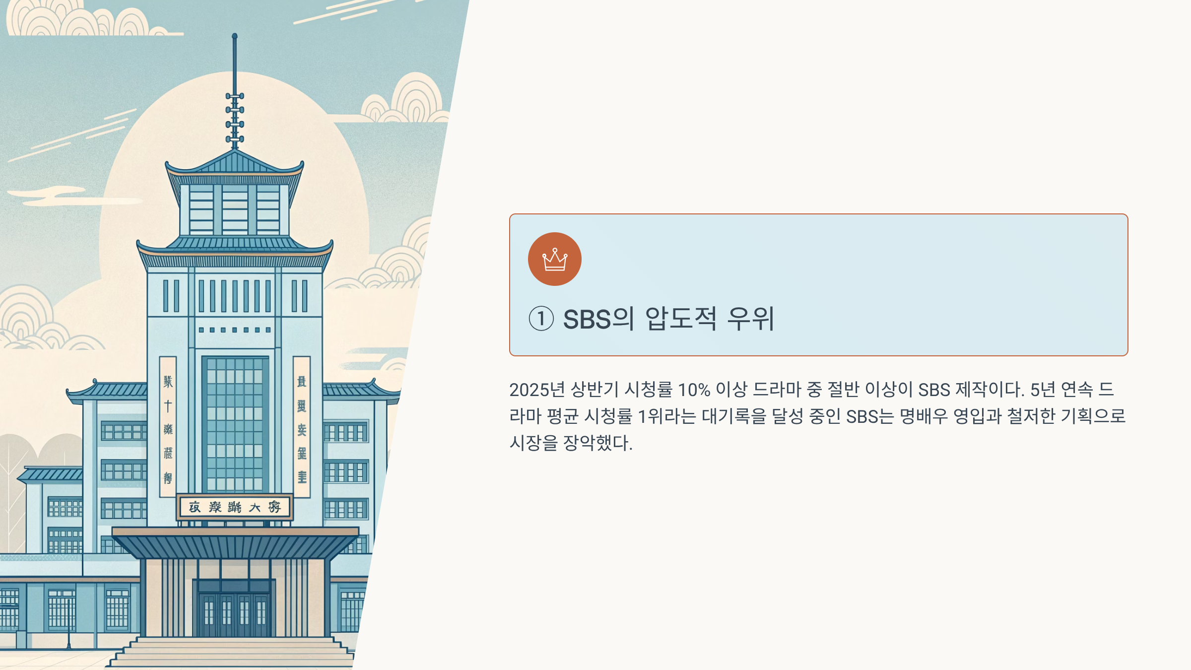 2025년 상반기 시청률 10% 이상 드라마 중 절반 이상이 SBS 제작이다. 5년 연속 드라마 평균 시청률 1위라는 대기록을 달성 중인 SBS는 명배우 영입과 철저한 기획으로 시장을 장악했다.