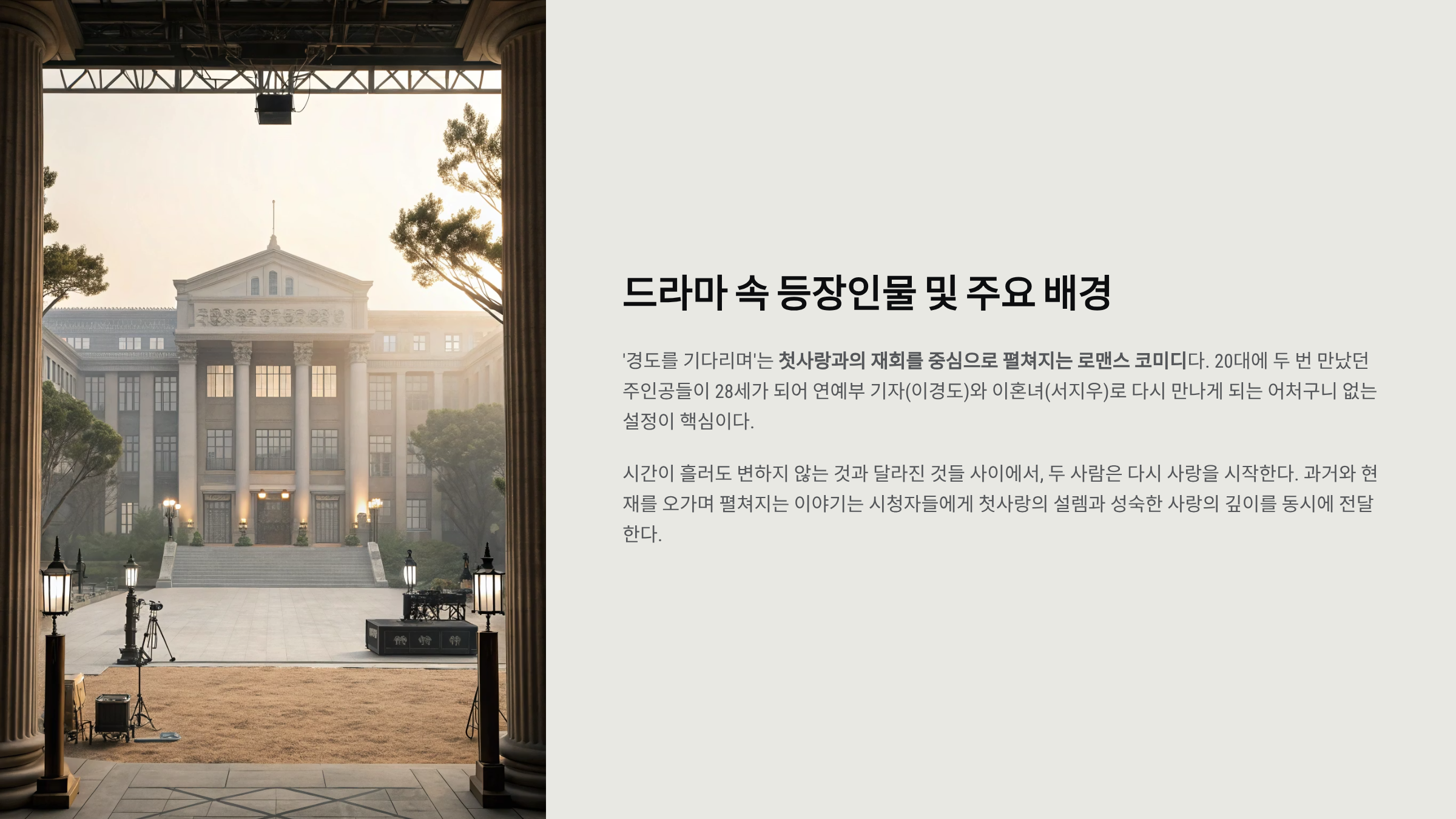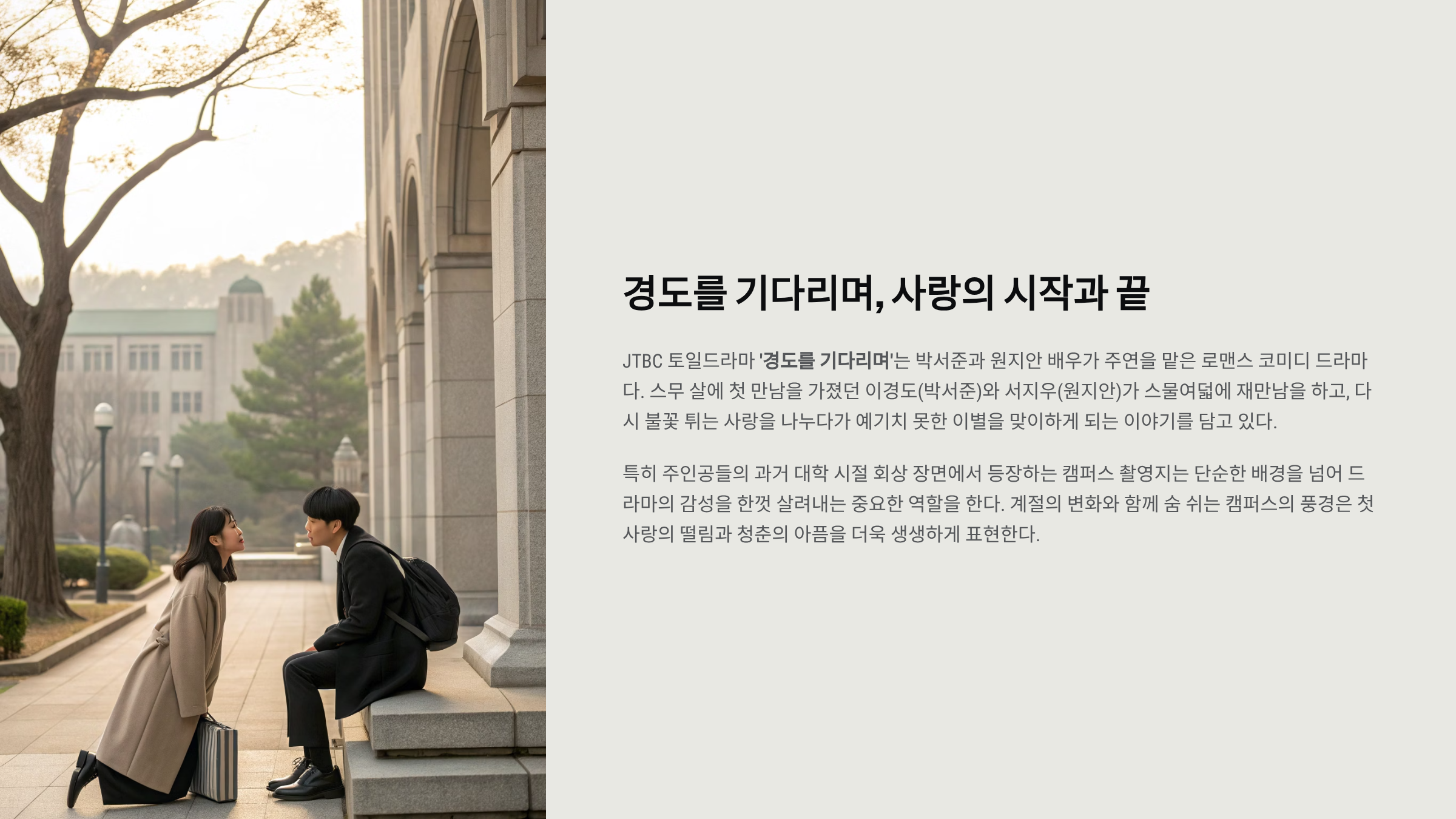 JTBC 토일드라마 **'경도를 기다리며'**는 박서준과 원지안 배우가 주연을 맡은 로맨스 코미디 드라마다. 스무 살에 첫 만남을 가졌던 이경도(박서준)와 서지우(원지안)가 스물여덟에 재만남을 하고, 다시 불꽃 튀는 사랑을 나누다가 예기치 못한 이별을 맞이하게 되는 이야기를 담고 있다. 특히 주인공들의 과거 대학 시절 회상 장면에서 등장하는 캠퍼스 촬영지는 단순한 배경을 넘어 드라마의 감성을 한껏 살려내는 중요한 역할을 한다.