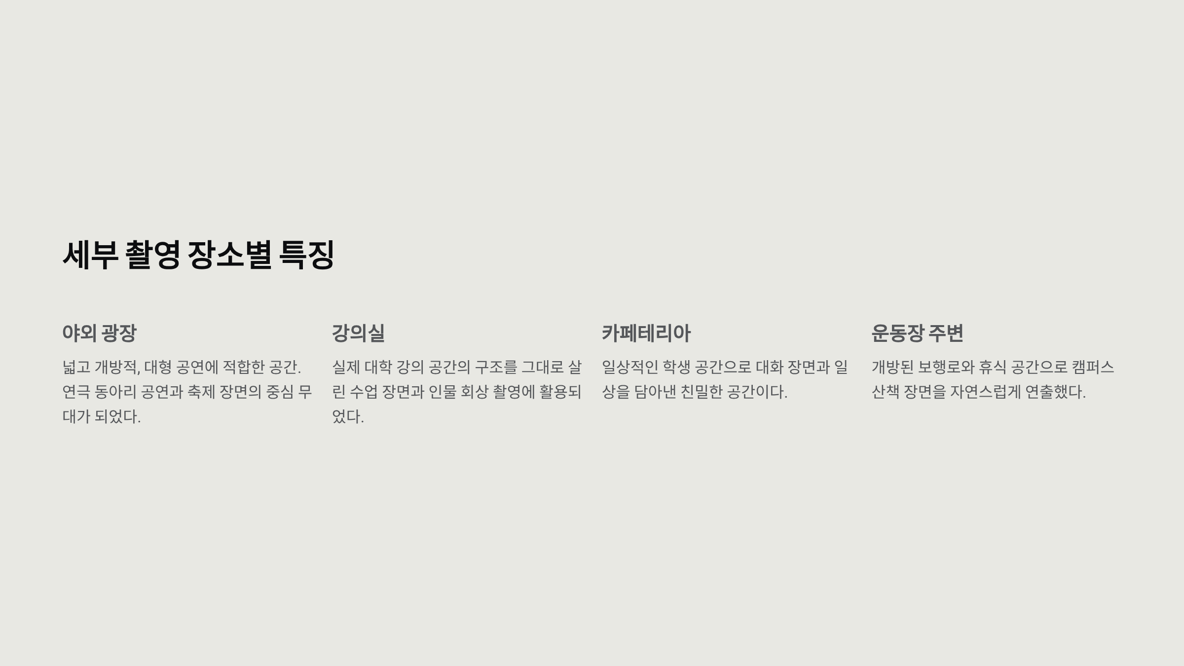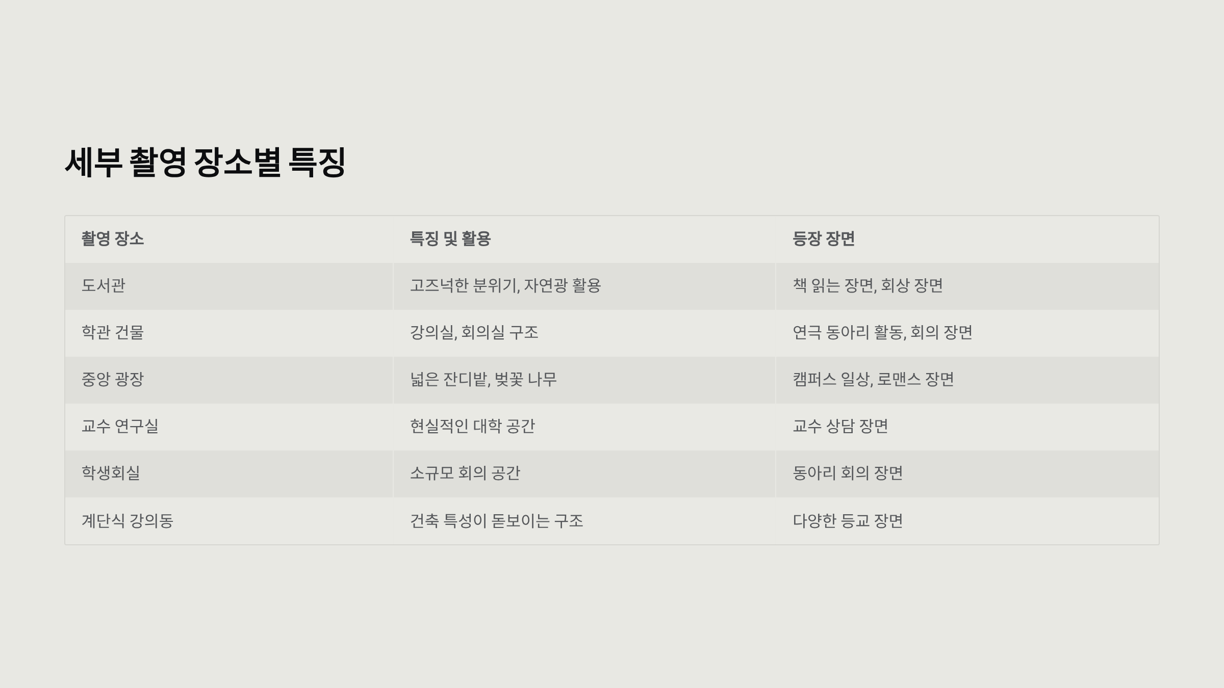 주인공들의 과거 시점을 표현하기 위해 캠퍼스 촬영이 매우 중요했으며, 덕성여대와 한남대학교는 이러한 회상 장면을 생생하게 담아내는 데 완벽한 역할을 했다. 특히 연극 동아리 활동이라는 구체적인 배경이 있어, 캠퍼스 촬영이 단순한 배경을 넘어 드라마의 스토리를 전달하는 중요한 요소가 되었다.