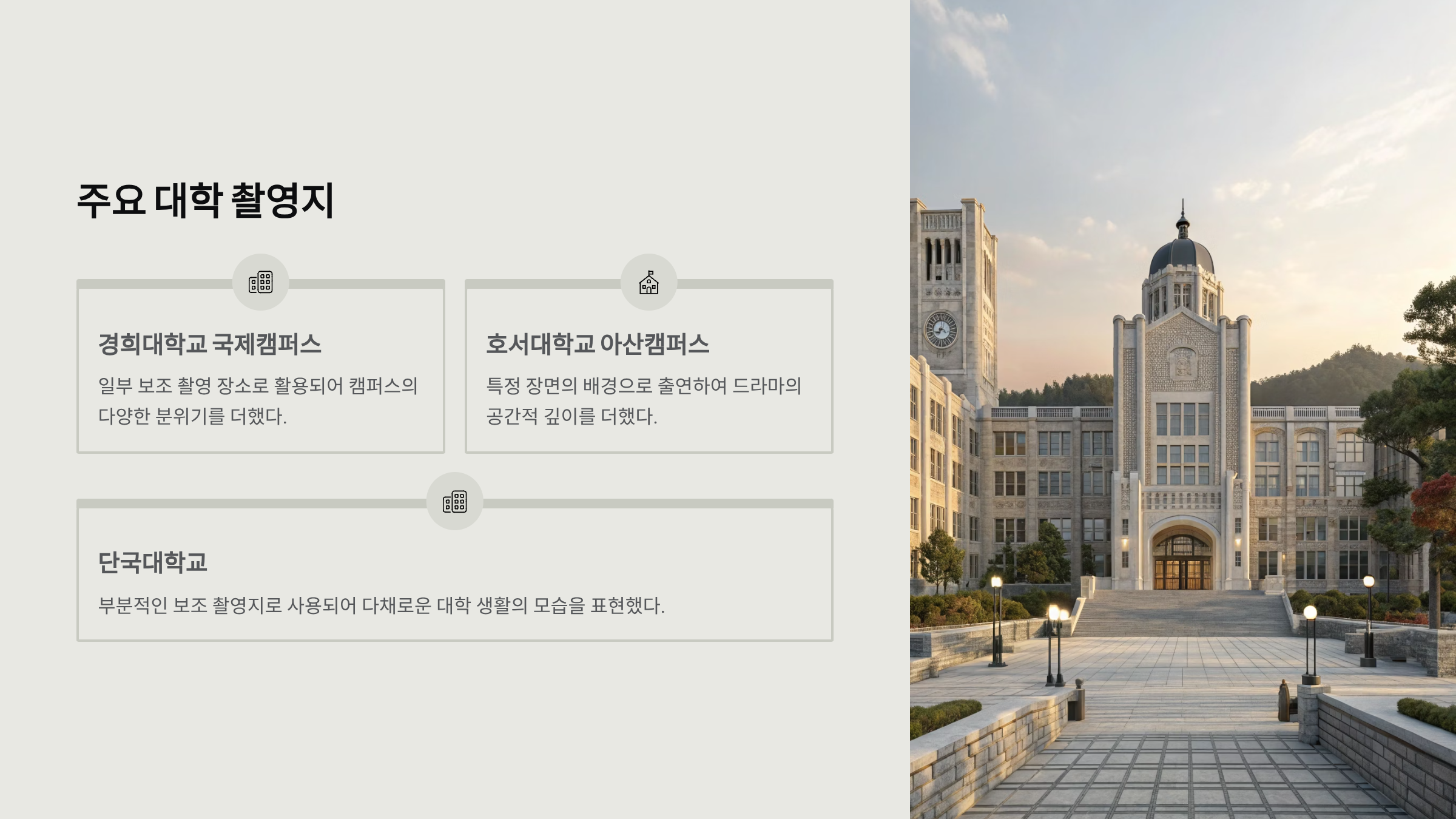 - 경희대학교 국제캠퍼스: 일부 보조 촬영 장소로 활용