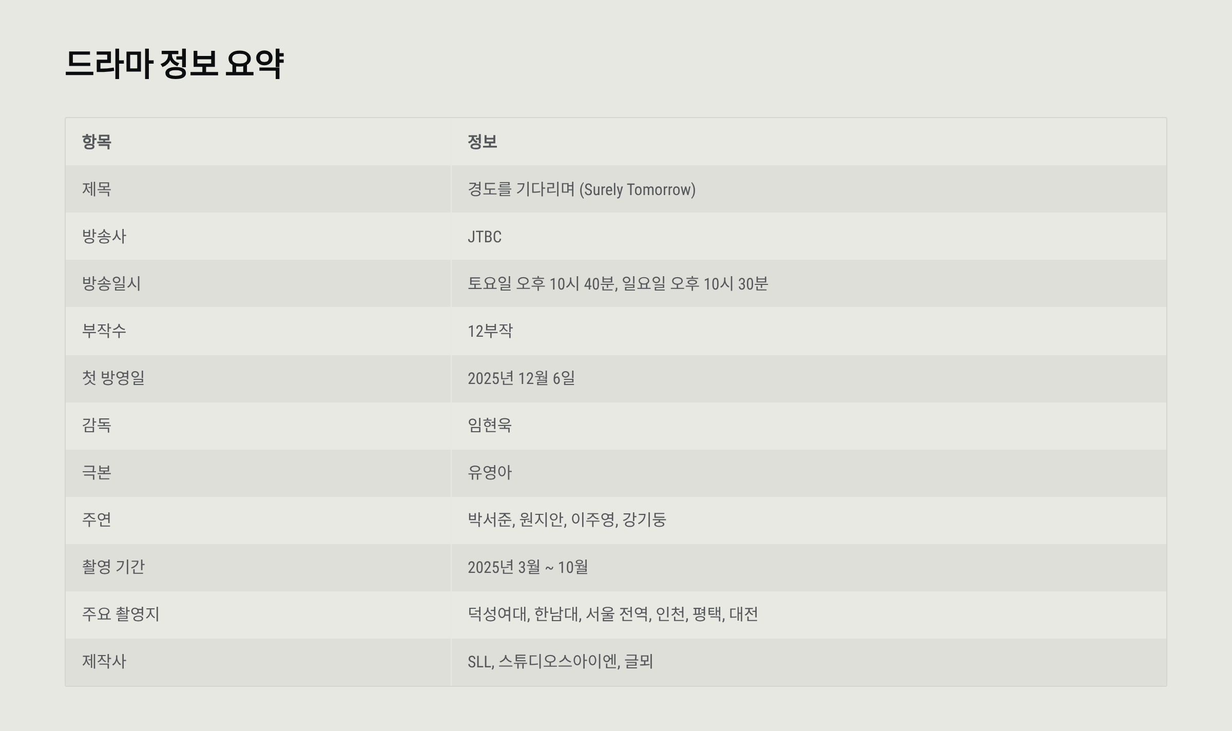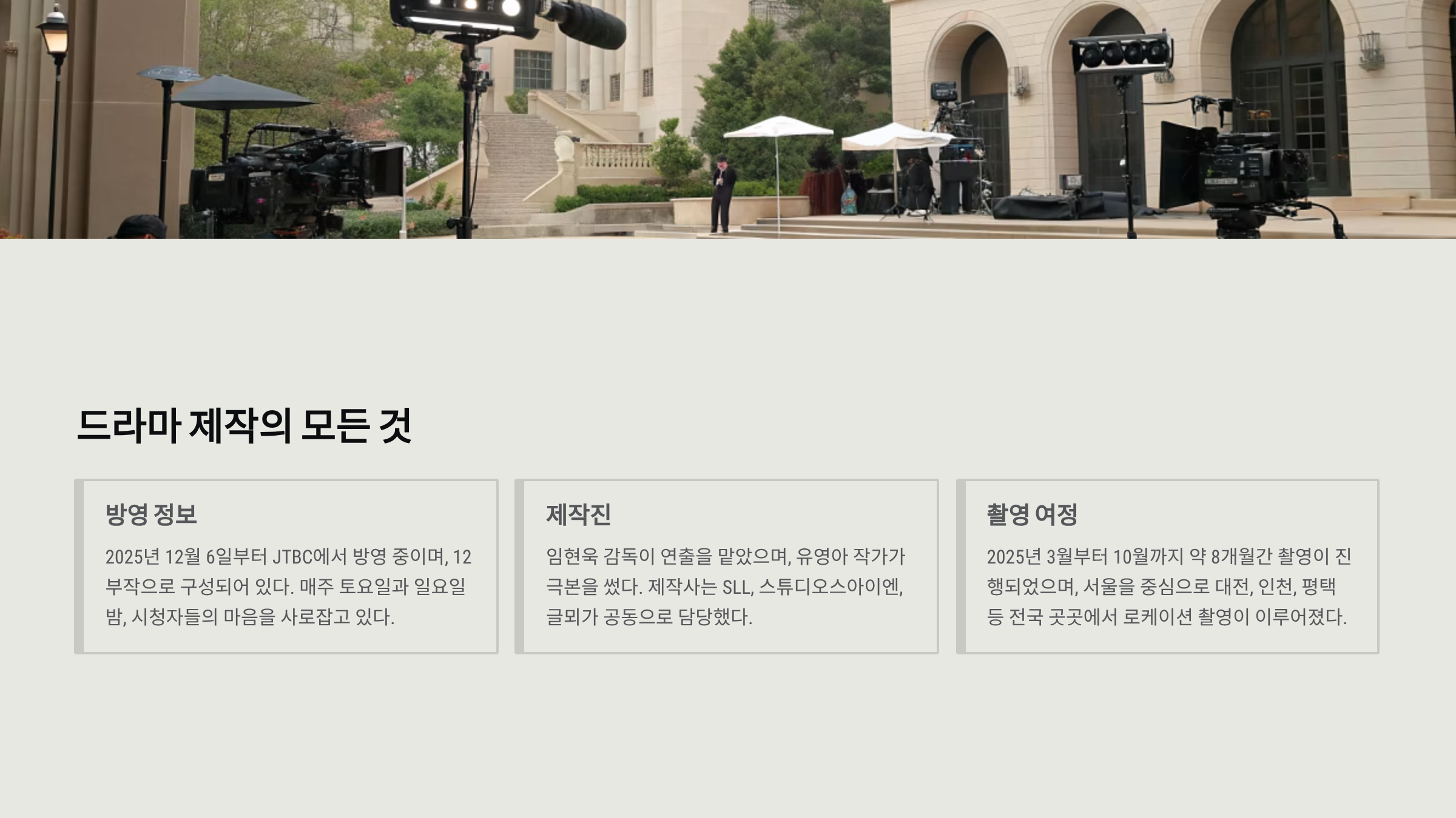 드라마는 2025년 12월 6일부터 JTBC에서 방영 중이며, 12부작으로 구성되어 있다. 임현욱 감독이 연출을 맡았으며, 유영아 작가가 극본을 썼다. 제작사는 SLL, 스튜디오스아이엔, 글뫼가 공동으로 담당했다. 2025년 3월부터 10월까지 약 8개월간 촬영이 진행되었으며, 서울을 중심으로 대전, 인천, 평택 등 전국 곳곳에서 로케이션 촬영이 이루어졌다.