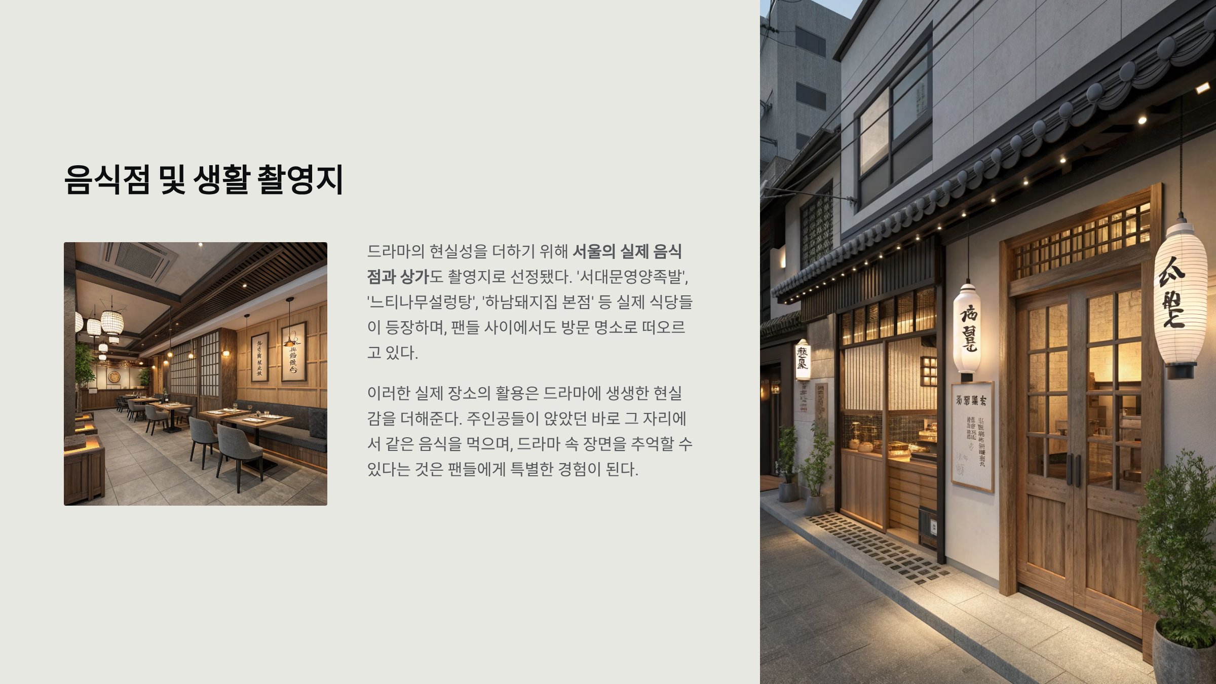 드라마의 현실성을 더하기 위해 서울의 실제 음식점과 상가도 촬영지로 선정됐다. '서대문영양족발', '느티나무설렁탕', '하남돼지집 본점' 등 실제 식당들이 등장하며, 팬들 사이에서도 방문 명소로 떠오르고 있다.