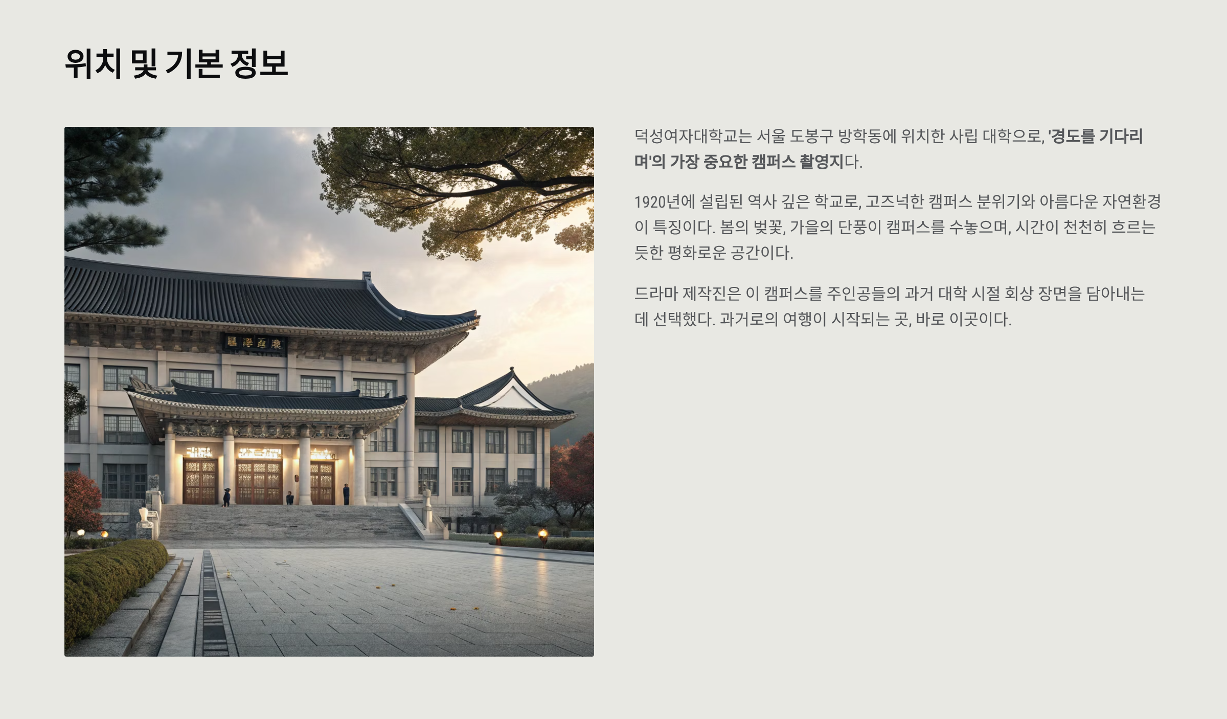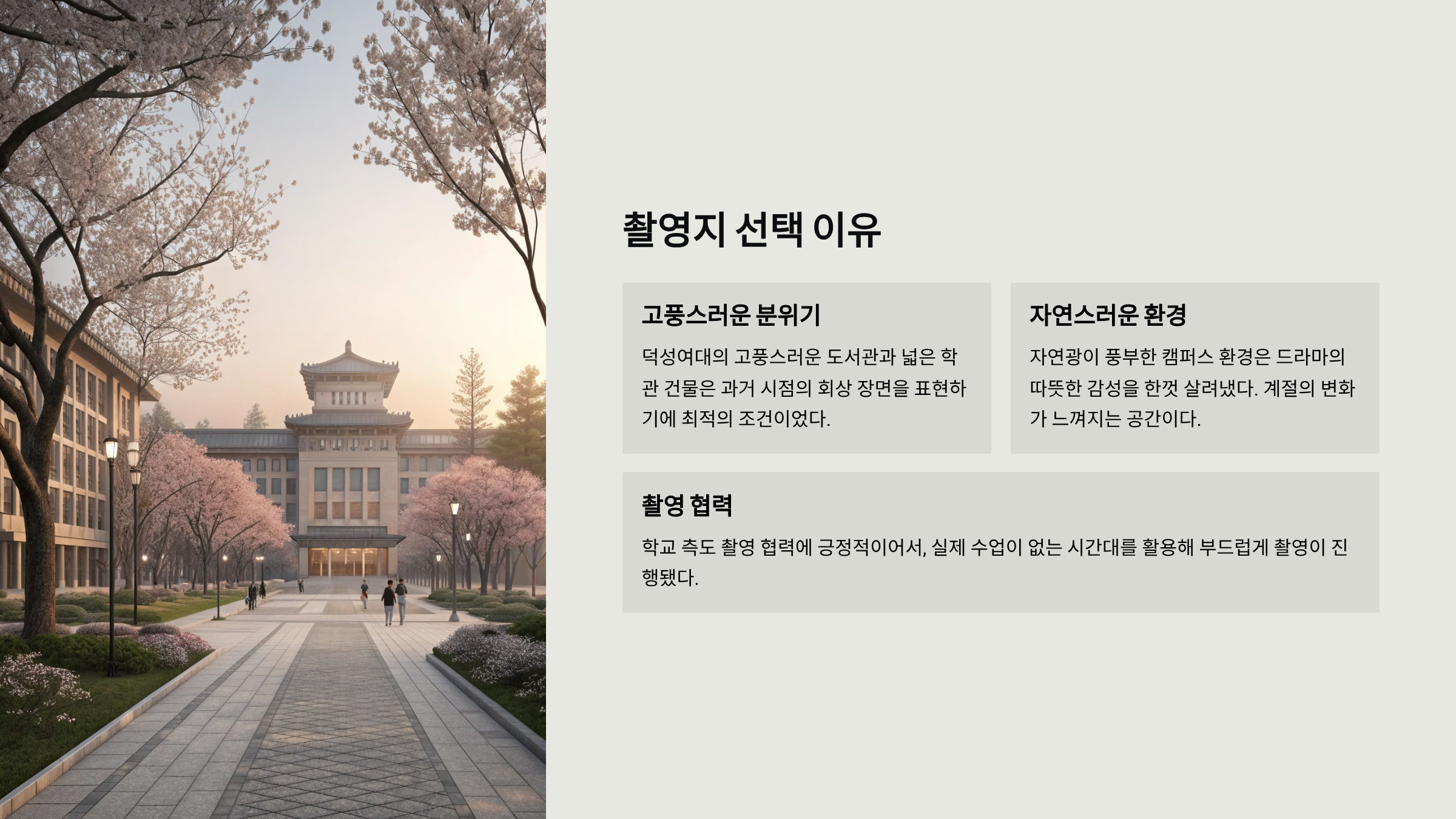 덕성여대의 고풍스러운 도서관과 넓은 학관 건물, 자연스러운 잔디광장은 과거 시점의 회상 장면을 표현하기에 최적의 조건이었다. 특히 자연광이 풍부한 캠퍼스 환경은 드라마의 따뜻한 감성을 한껏 살려냈다. 학교 측도 촬영 협력에 긍정적이어서, 실제 수업이 없는 시간대를 활용해 부드럽게 촬영이 진행됐다.