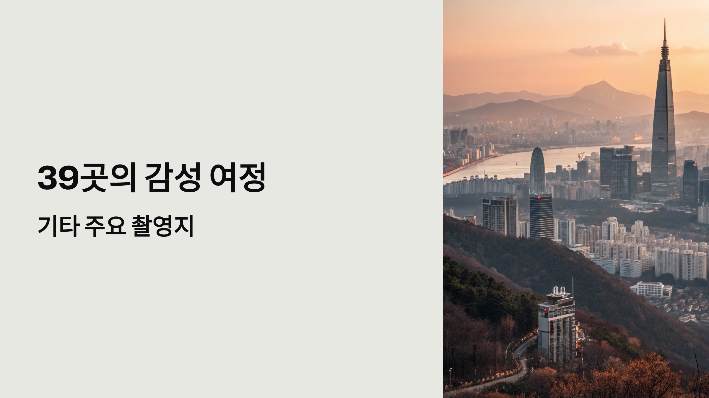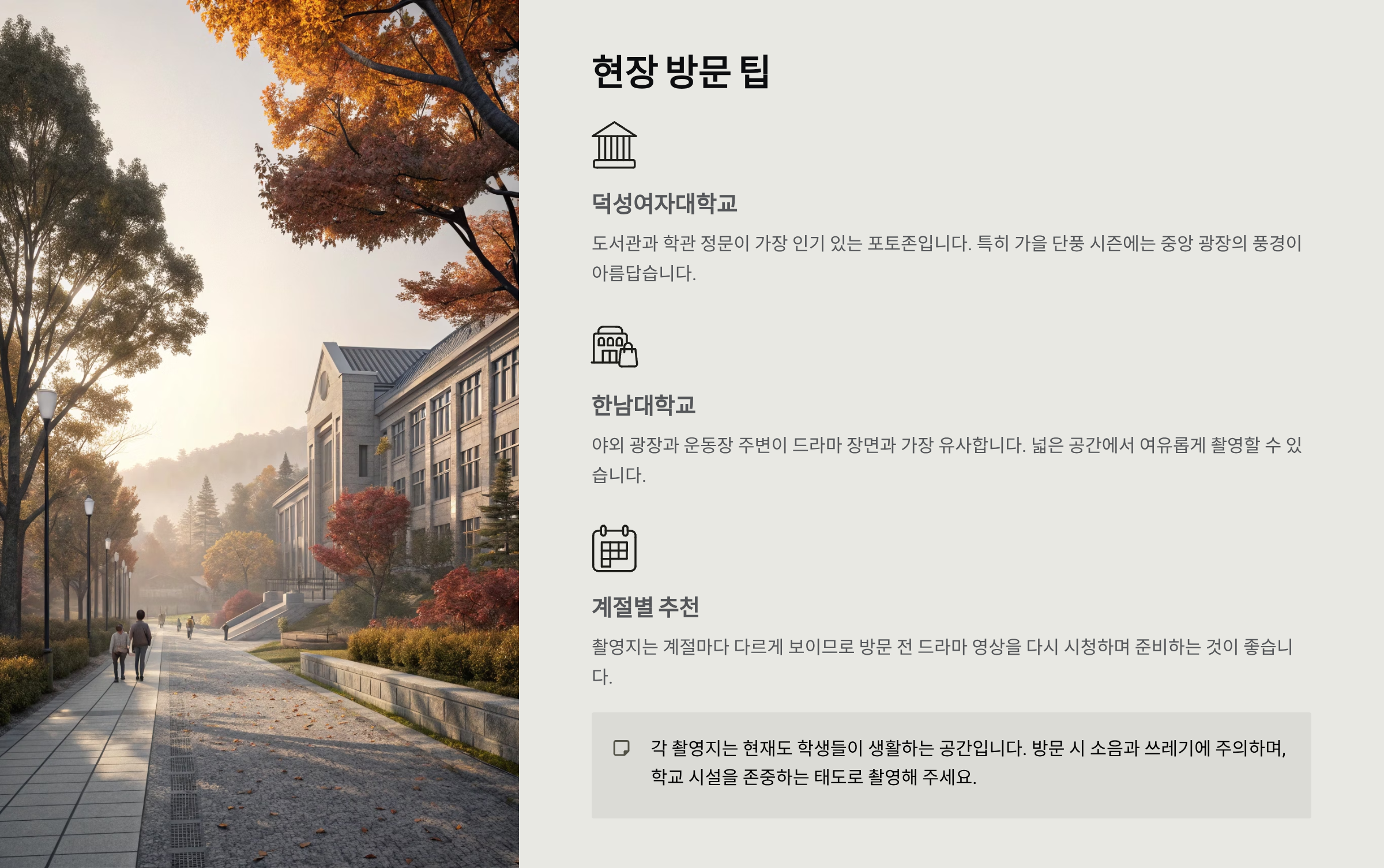 - 촬영지는 계절마다 다르게 보이므로 방문 전 드라마 영상 시청 권장