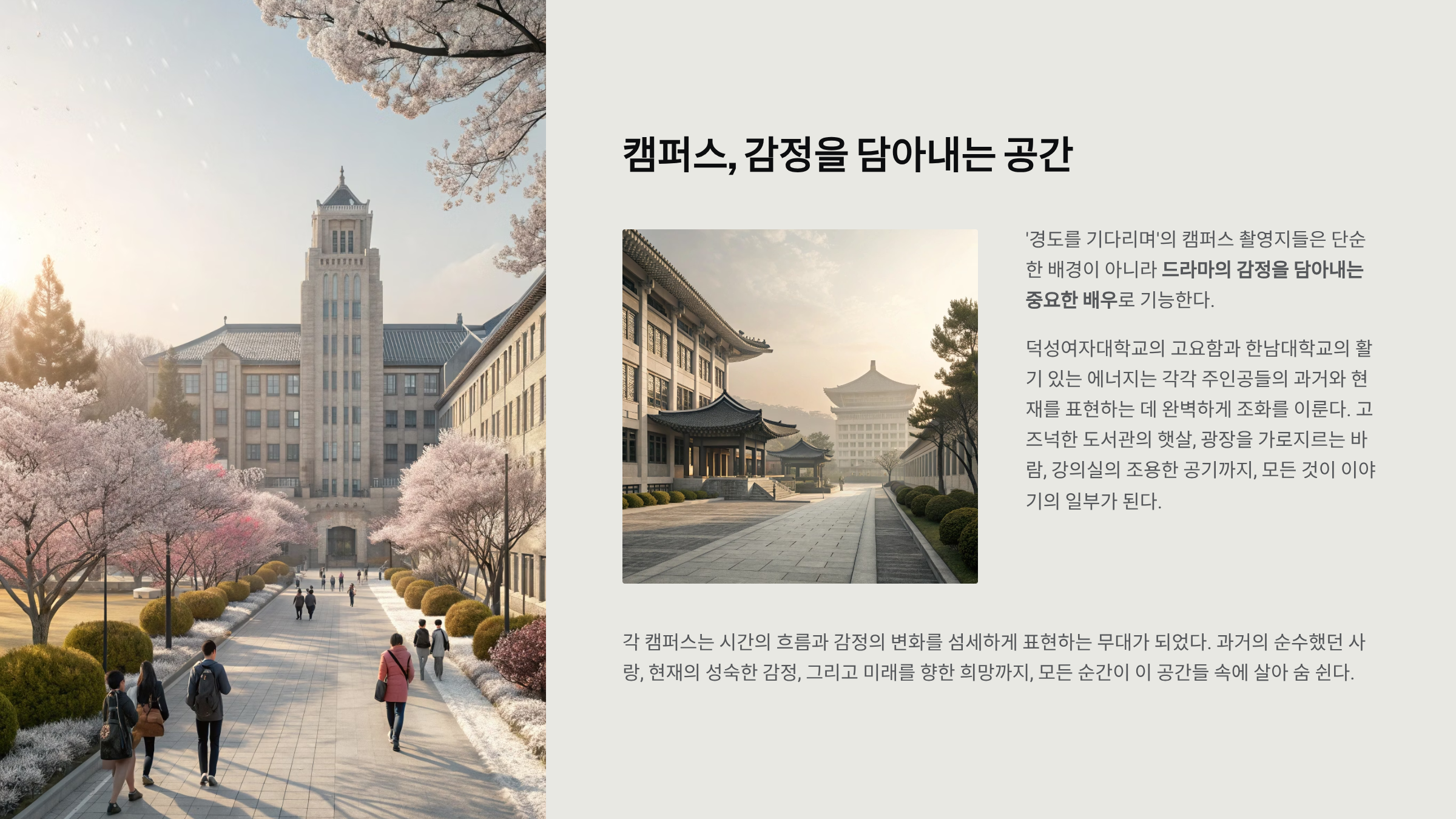'경도를 기다리며'의 캠퍼스 촬영지들은 단순한 배경이 아니라 드라마의 감정을 담아내는 중요한 배우로 기능한다. 덕성여자대학교의 고요함과 한남대학교의 활기 있는 에너지는 각각 주인공들의 과거와 현재를 표현하는 데 완벽하게 조화를 이룬다.