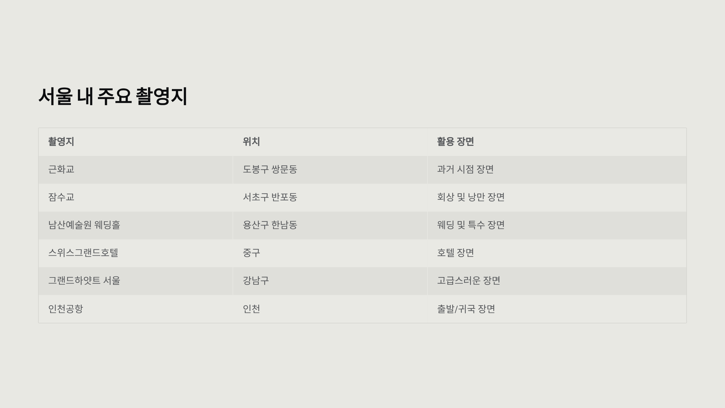 | 주요 촬영지 | 덕성여대, 한남대, 서울 전역, 인천, 평택, 대전 |