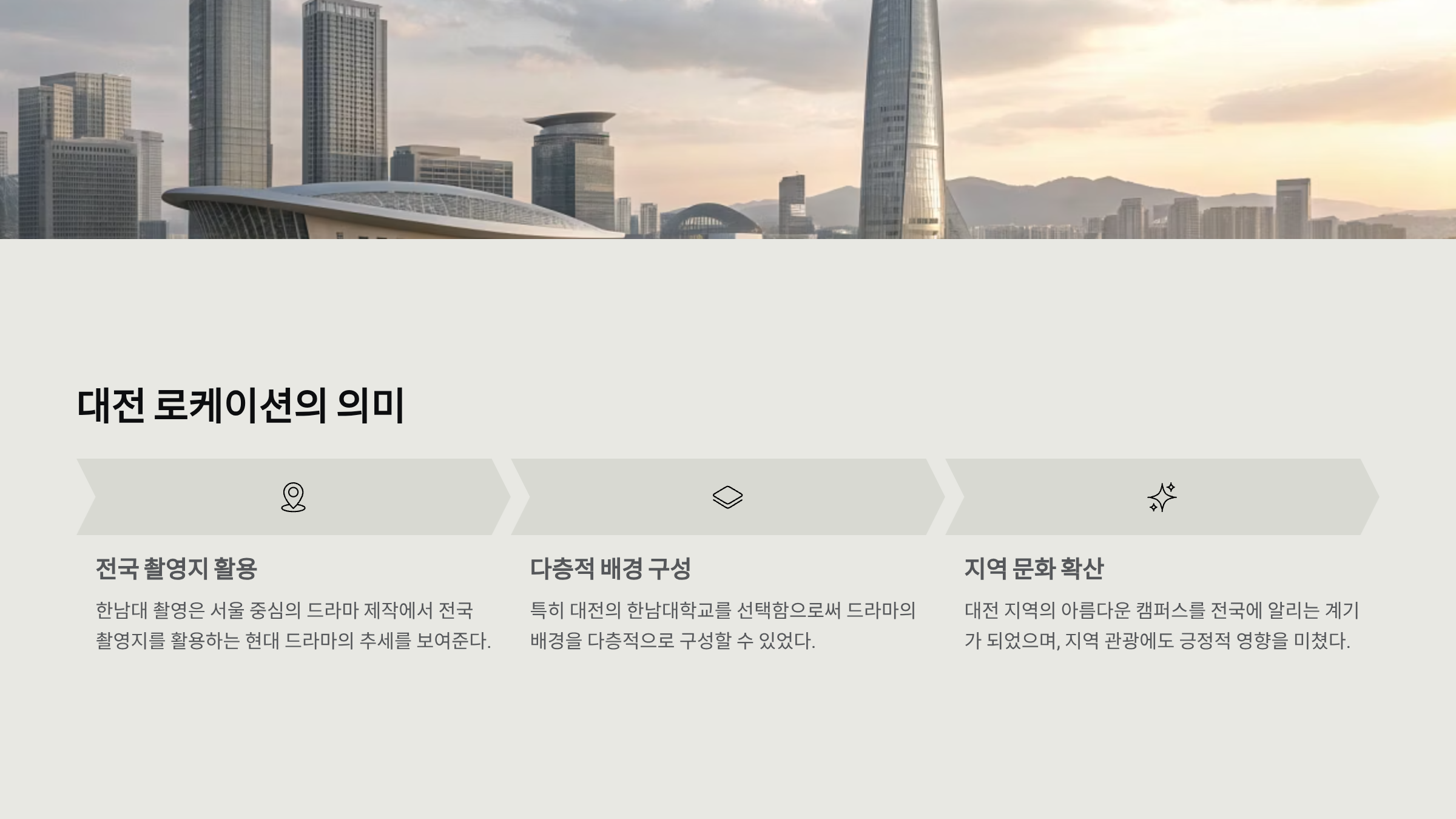 한남대 촬영은 서울 중심의 드라마 제작에서 전국 촬영지를 활용하는 현대 드라마의 추세를 보여준다. 특히 대전의 한남대학교를 선택함으로써 드라마의 배경을 다층적으로 구성할 수 있었다.