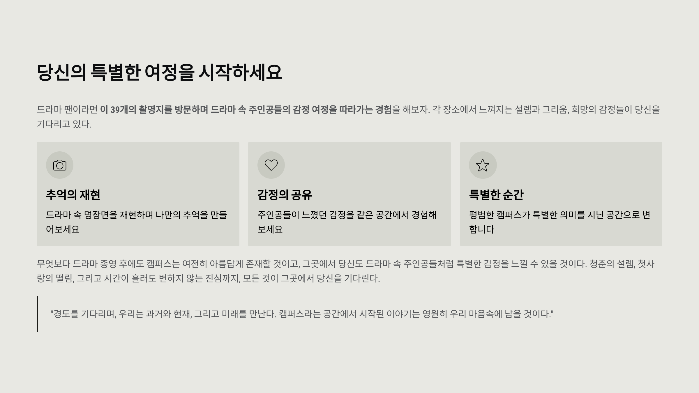 드라마 팬이라면 이 39개의 촬영지를 방문하며 드라마 속 주인공들의 감정 여정을 따라가는 경험을 해보자. 무엇보다 드라마 종영 후에도 캠퍼스는 여전히 아름답게 존재할 것이고, 그곳에서 당신도 드라마 속 주인공들처럼 특별한 감정을 느낄 수 있을 것이다.