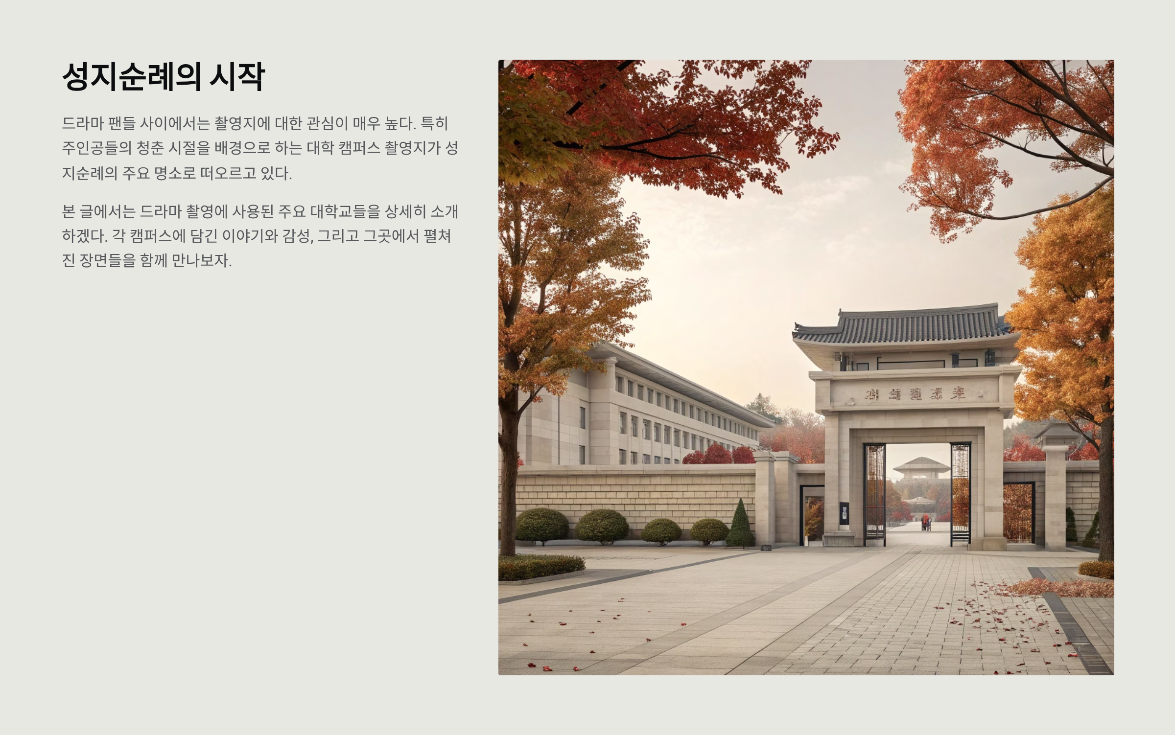 드라마 팬들 사이에서는 촬영지에 대한 관심이 매우 높다. 특히 주인공들의 청춘 시절을 배경으로 하는 대학 캠퍼스 촬영지가 성지순례의 주요 명소로 떠오르고 있다. 본 글에서는 드라마 촬영에 사용된 주요 대학교들을 상세히 소개하겠다.