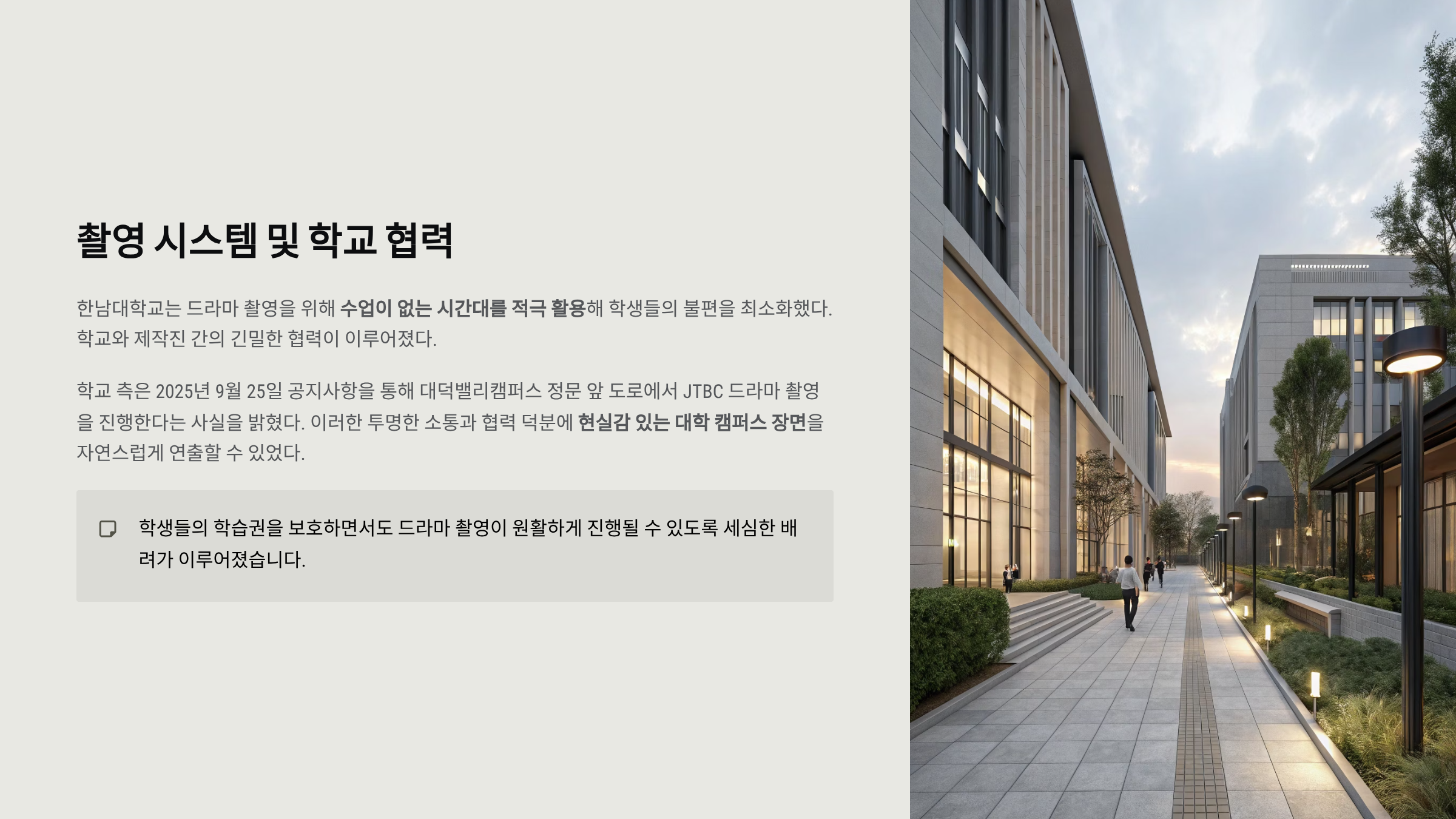 한남대학교는 드라마 촬영을 위해 수업이 없는 시간대를 적극 활용해 학생들의 불편을 최소화했다. 학교 측은 2025년 9월 25일 공지사항을 통해 대덕밸리캠퍼스 정문 앞 도로에서 JTBC 드라마 촬영을 진행한다는 사실을 밝혔다. 이러한 협력 덕분에 현실감 있는 대학 캠퍼스 장면을 자연스럽게 연출할 수 있었다.