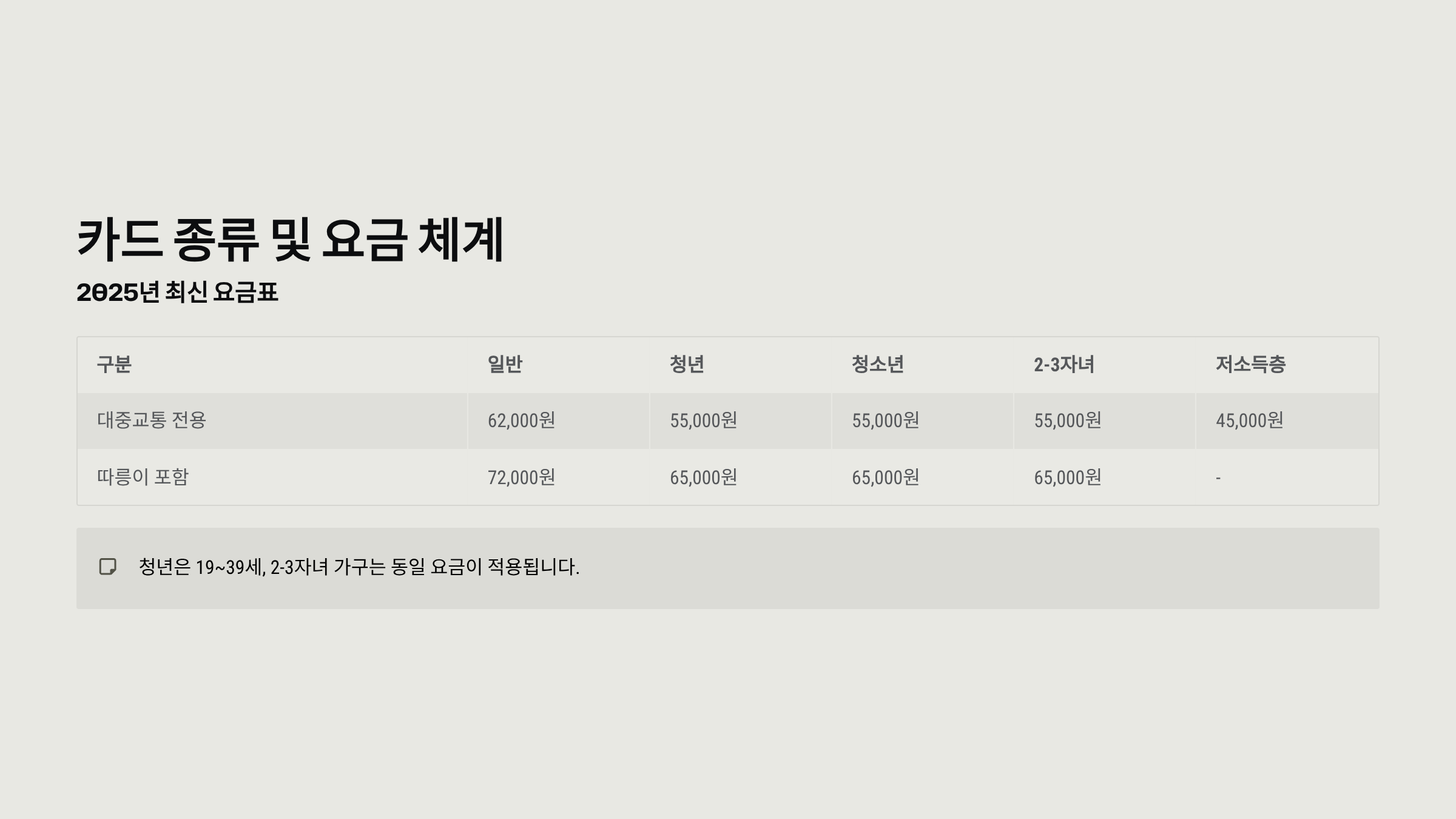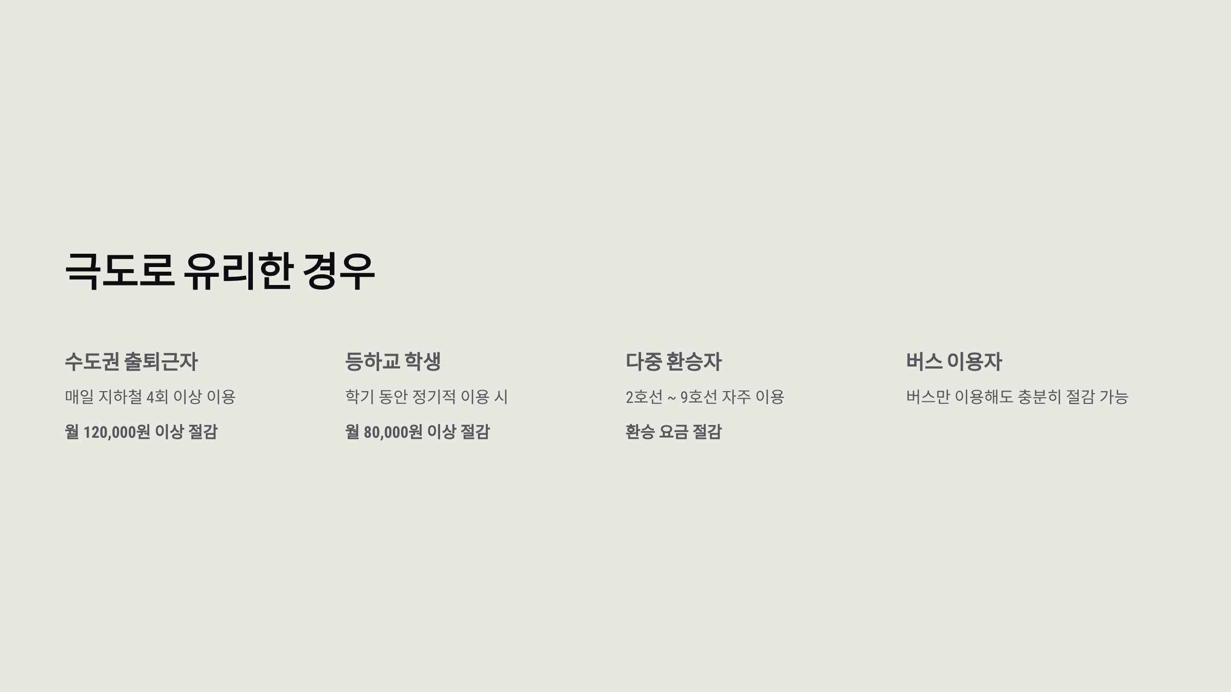 - 수도권 출퇴근자: 매일 지하철 4회 이상 이용 (월 120,000원 이상 절감)