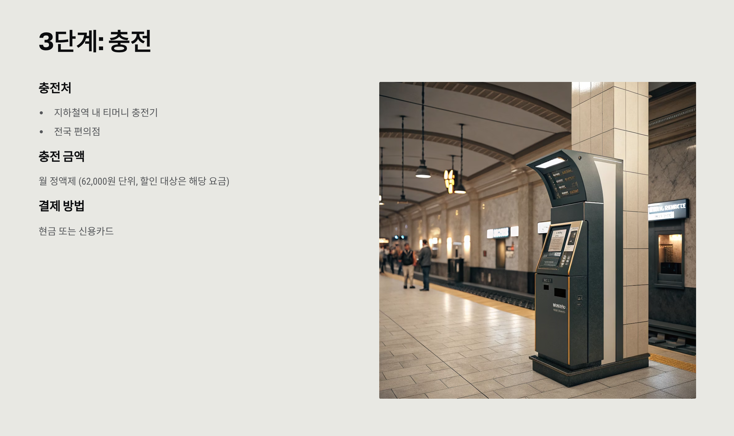- 충전처: 지하철역 내 티머니 충전기, 전국 편의점