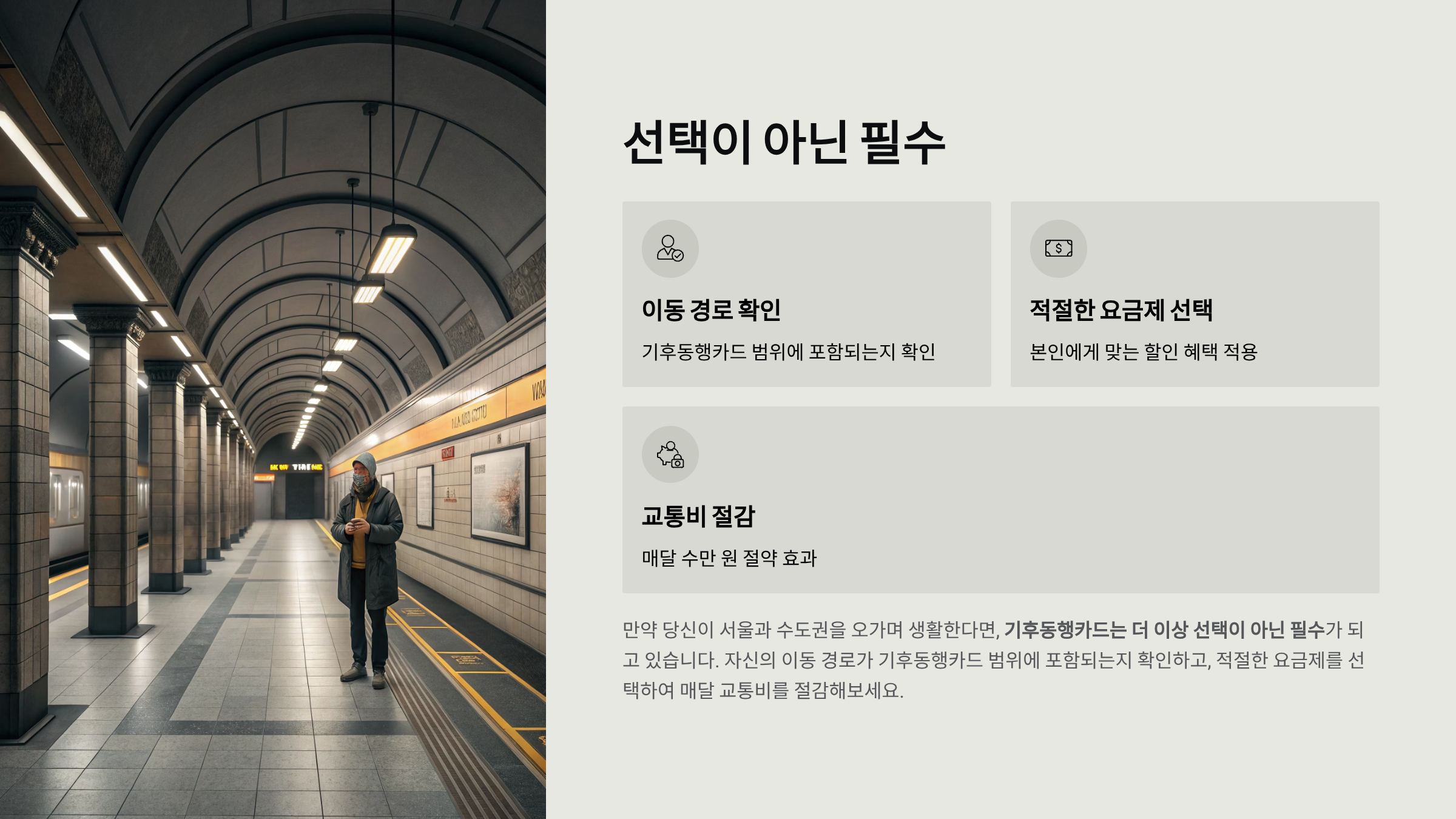 만약 당신이 서울과 수도권을 오가며 생활한다면, 기후동행카드는 더 이상 선택이 아닌 필수가 되고 있다. 자신의 이동 경로가 기후동행카드 범위에 포함되는지 확인하고, 적절한 요금제를 선택하여 매달 교통비를 절감해보자.