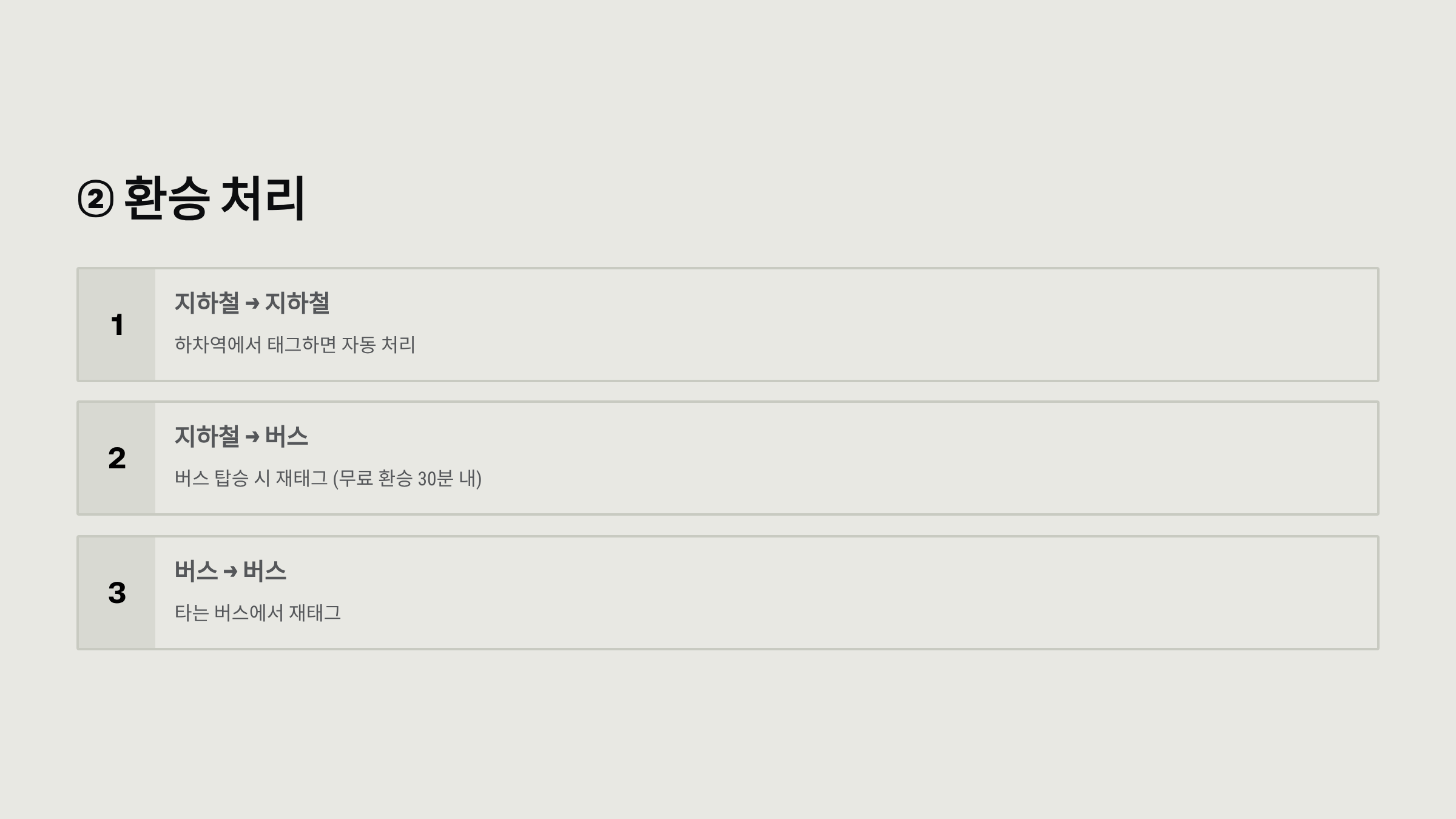 - 지하철에서 지하철로 환승: 하차역에서 태그하면 자동 처리