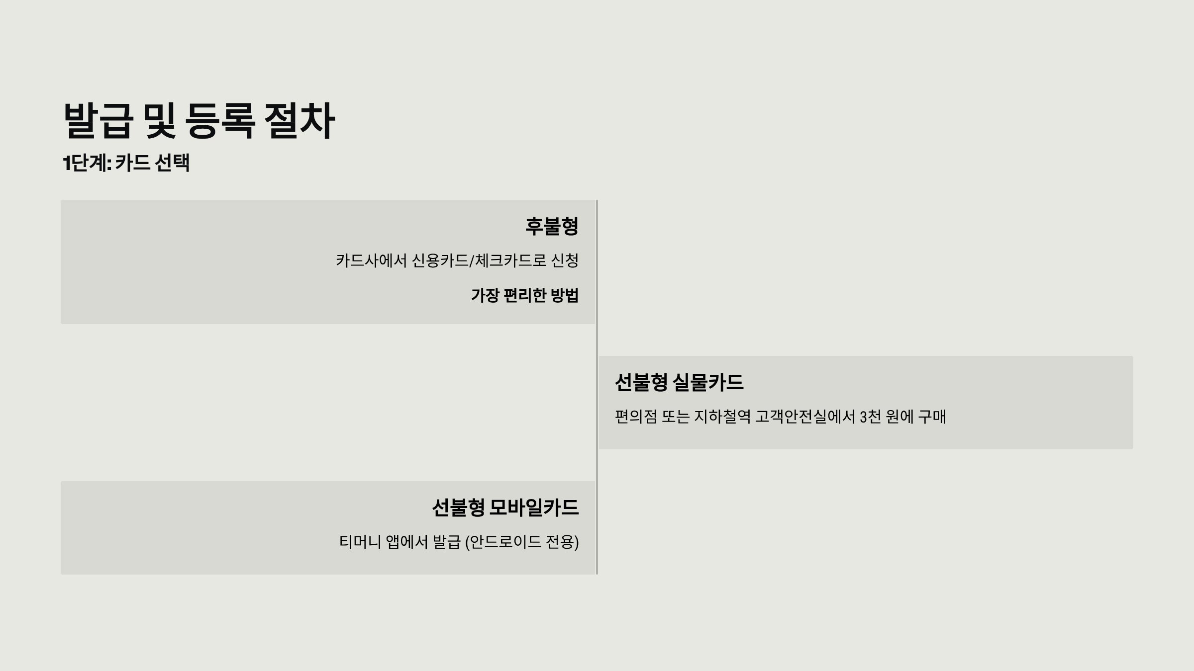 - 선불형 모바일카드: 티머니 앱에서 발급 (안드로이드 전용)