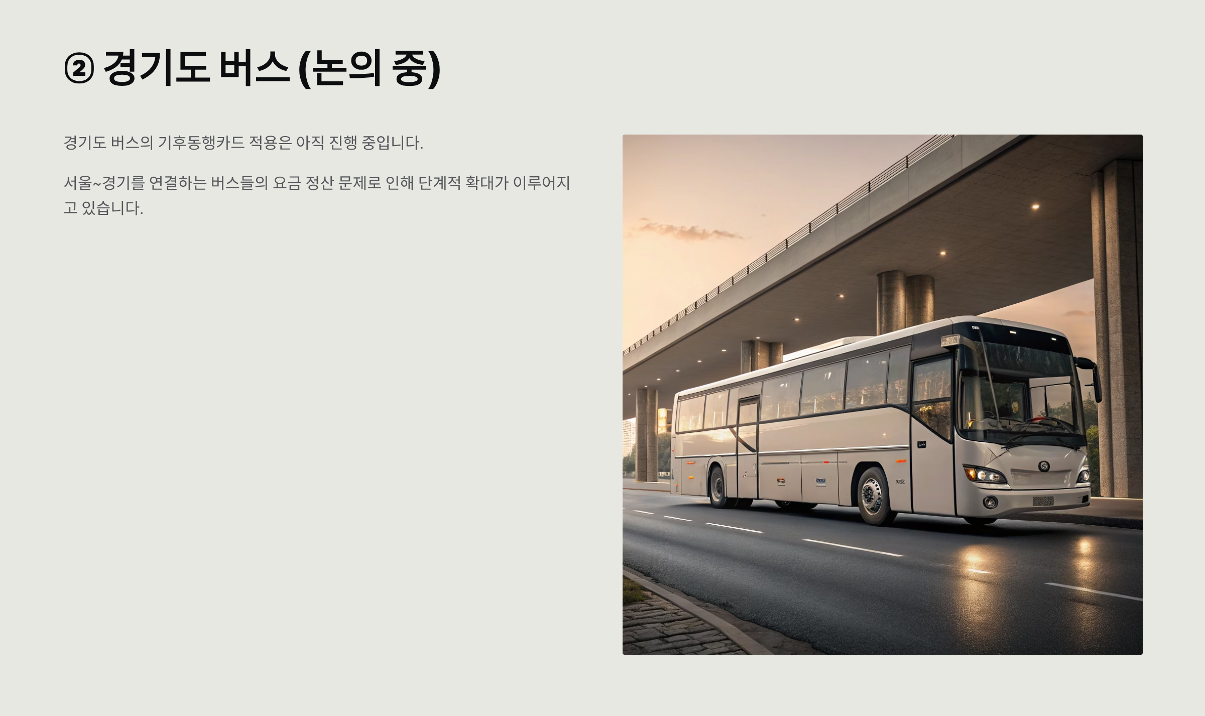 경기도 버스의 기후동행카드 적용은 아직 진행 중이다. 서울~경기를 연결하는 버스들의 요금 정산 문제로 인해 단계적 확대가 이루어지고 있다.