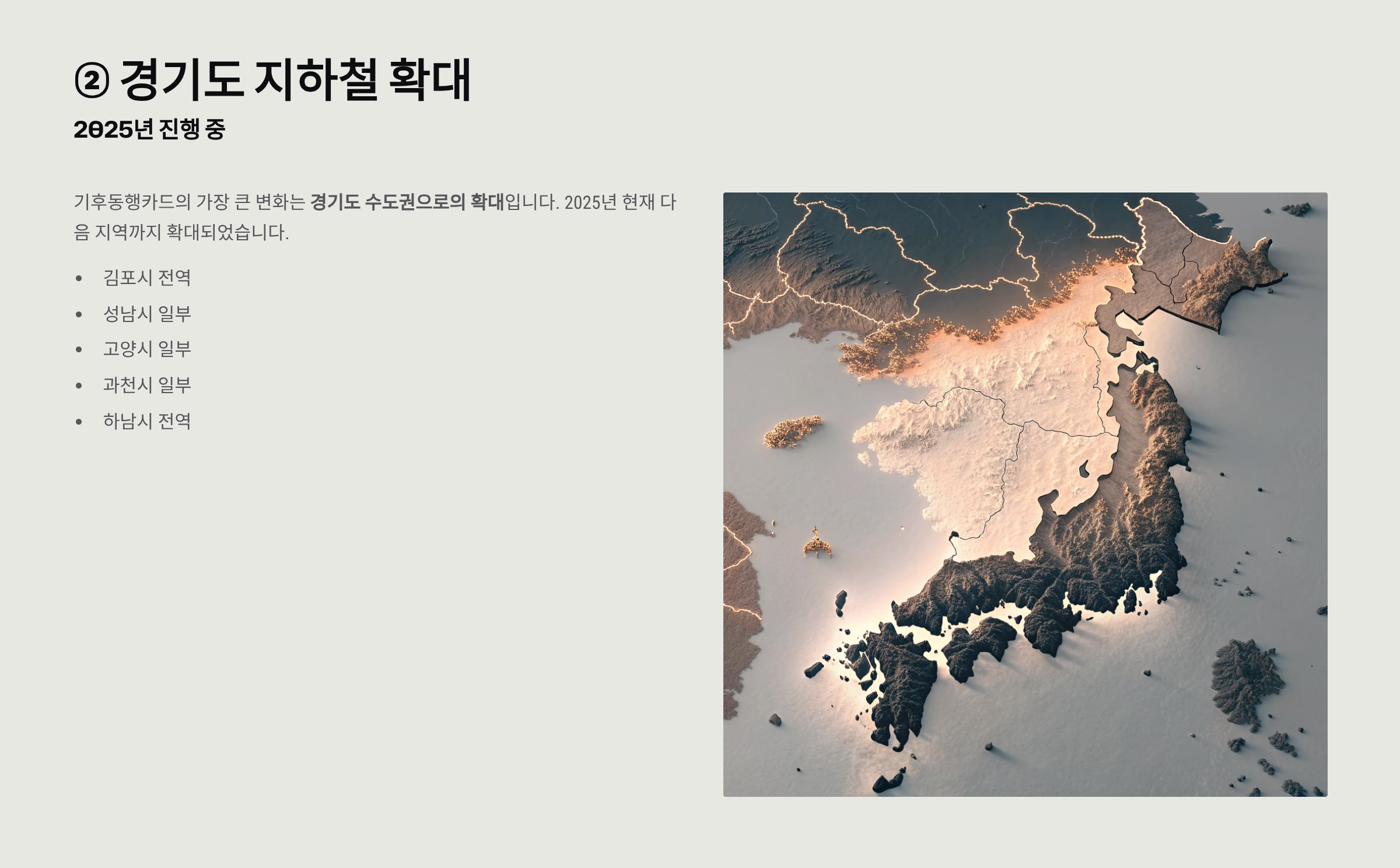 기후동행카드의 가장 큰 변화는 경기도 수도권으로의 확대다. 2025년 현재 다음 지역까지 확대되었다.