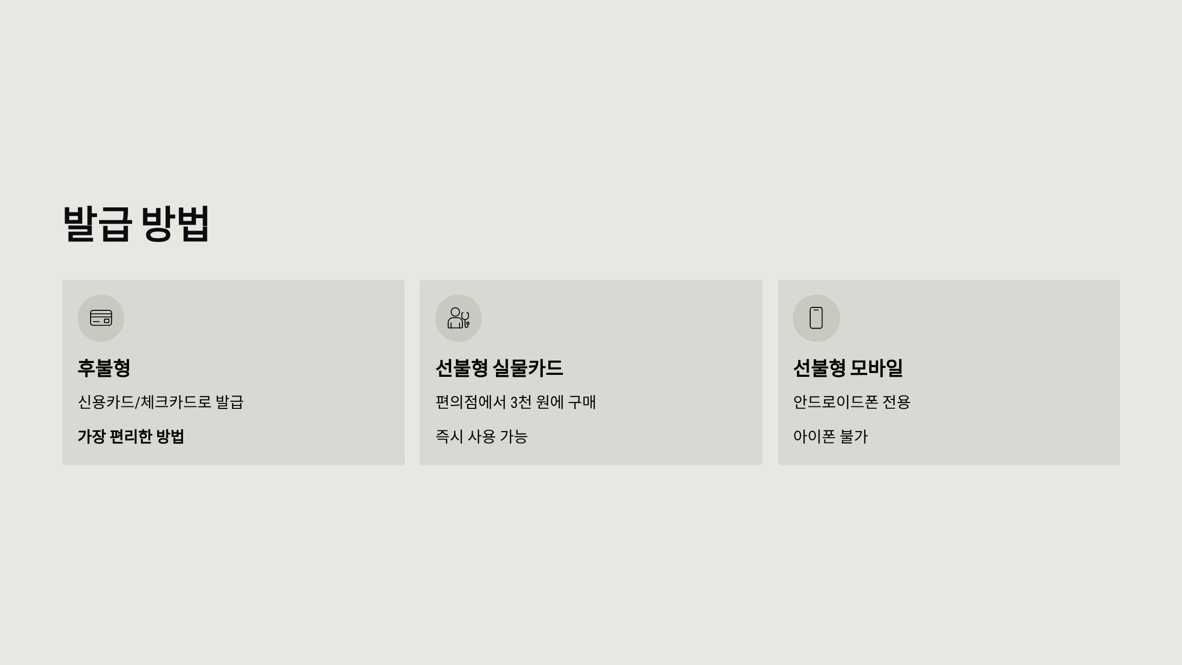 - 후불형: 신용카드/체크카드로 발급 (가장 편리)