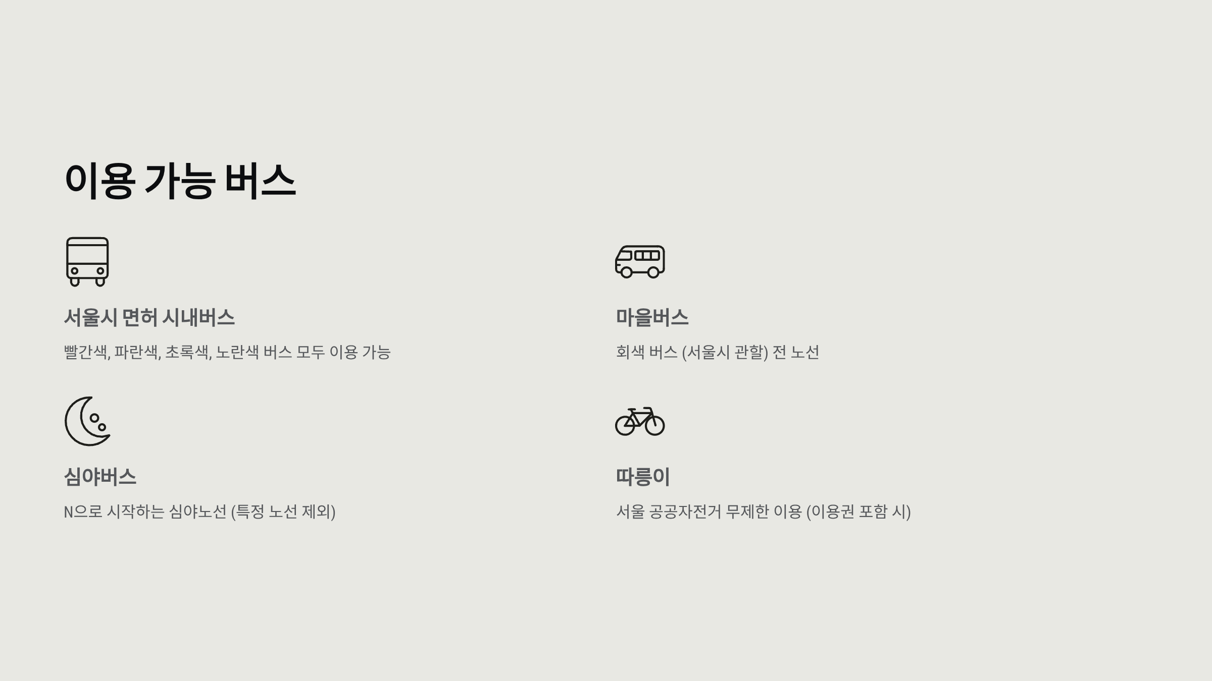 - 심야버스: N으로 시작하는 심야노선 (특정 노선 제외)