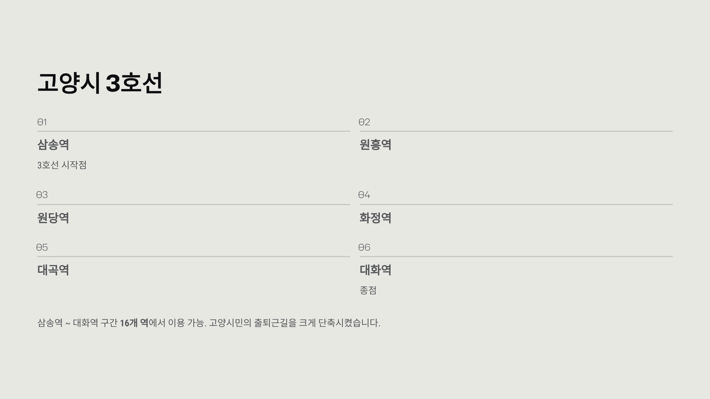 - 삼송역 ~ 대화역 구간 (삼송, 원흥, 원당, 화정, 대곡 등)