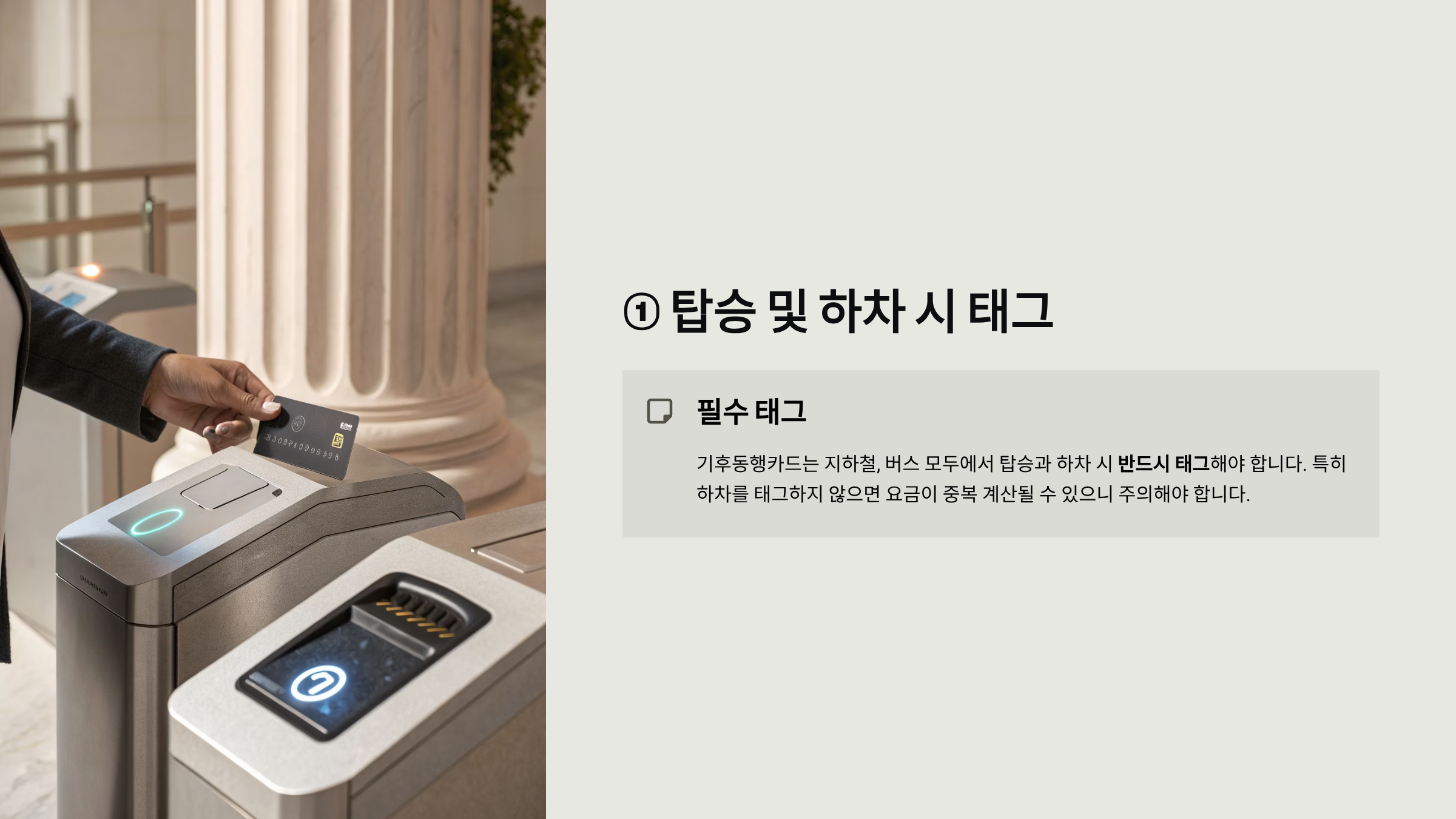 기후동행카드는 지하철, 버스 모두에서 탑승과 하차 시 반드시 태그해야 한다. 특히 하차를 태그하지 않으면 요금이 중복 계산될 수 있으니 주의해야 한다.