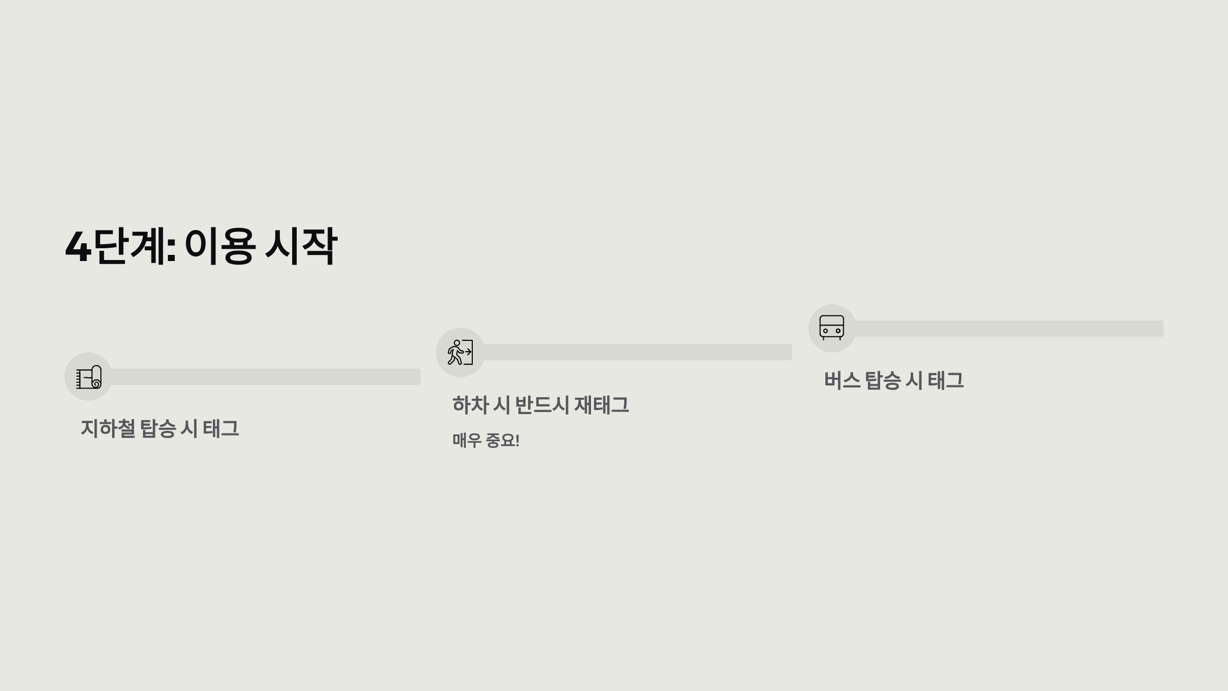 - 지하철에서 버스로 환승: 버스 탑승 시 재태그 (무료 환승 30분 내)
