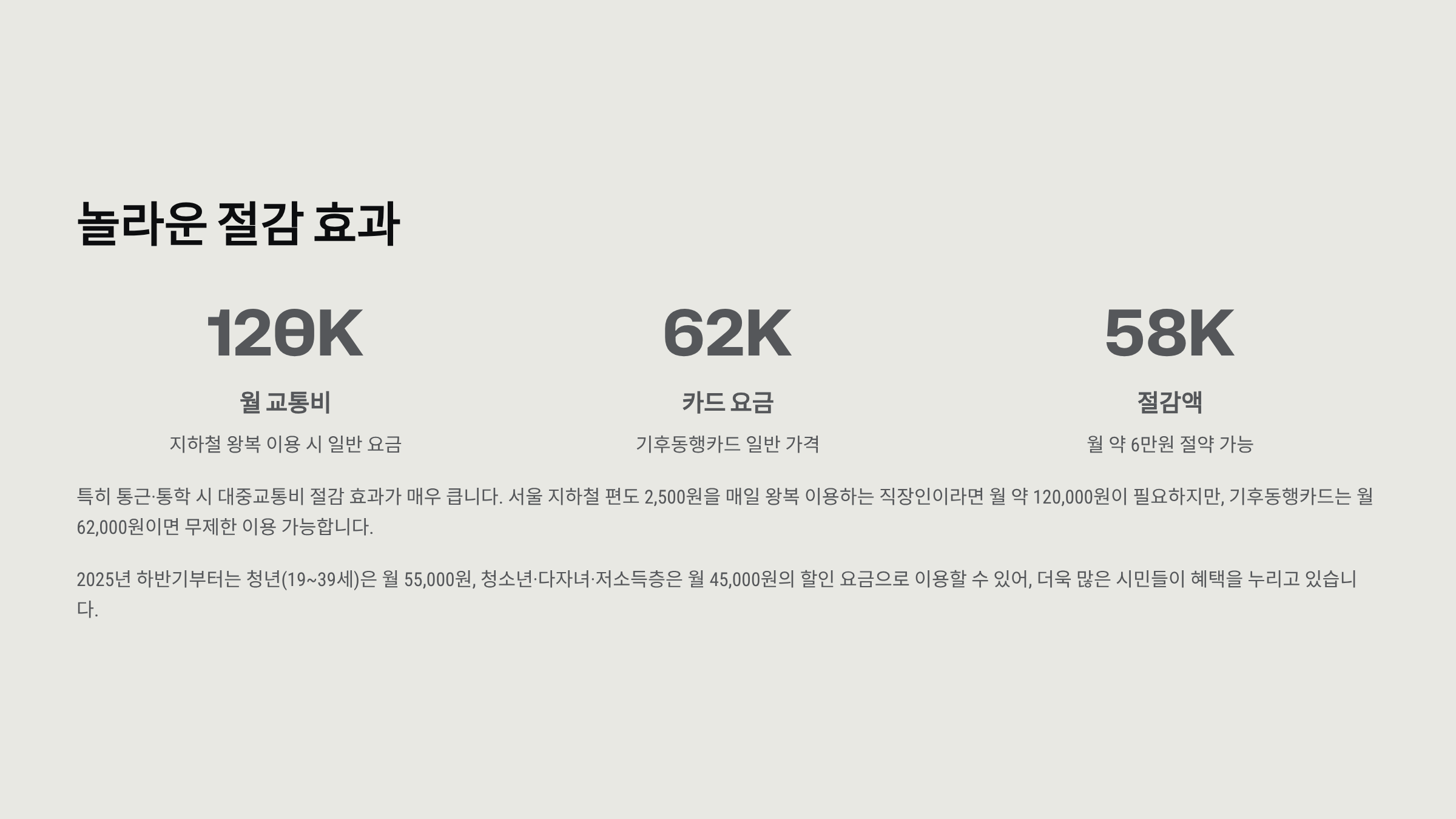 특히 통근·통학 시 대중교통비 절감 효과가 매우 크다. 예를 들어, 서울 지하철 편도 2,500원을 매일 왕복 이용하는 직장인이라면 월 약 120,000원이 필요하지만, 기후동행카드는 월 62,000원이면 무제한 이용 가능하다. 더욱이 2025년 하반기부터는 청년(19~39세)은 월 55,000원, 청소년·다자녀·저소득층은 월 45,000원의 할인 요금으로 이용할 수 있어, 더욱 많은 시민들이 혜택을 누리고 있다.