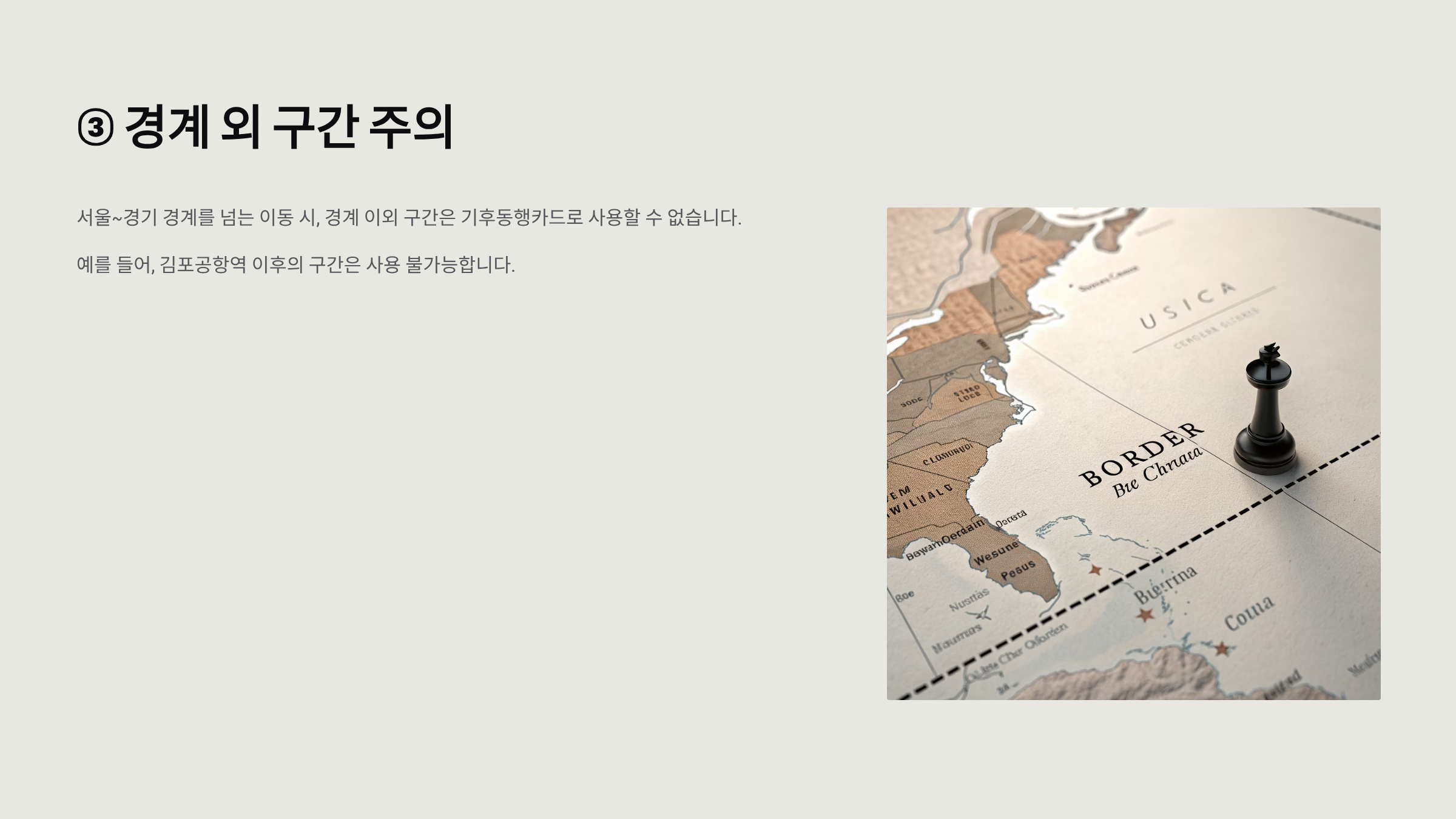 서울~경기 경계를 넘는 이동 시, 경계 이외 구간은 기후동행카드로 사용할 수 없다. 예를 들어, 김포공항역 이후의 구간은 사용 불가능하다.