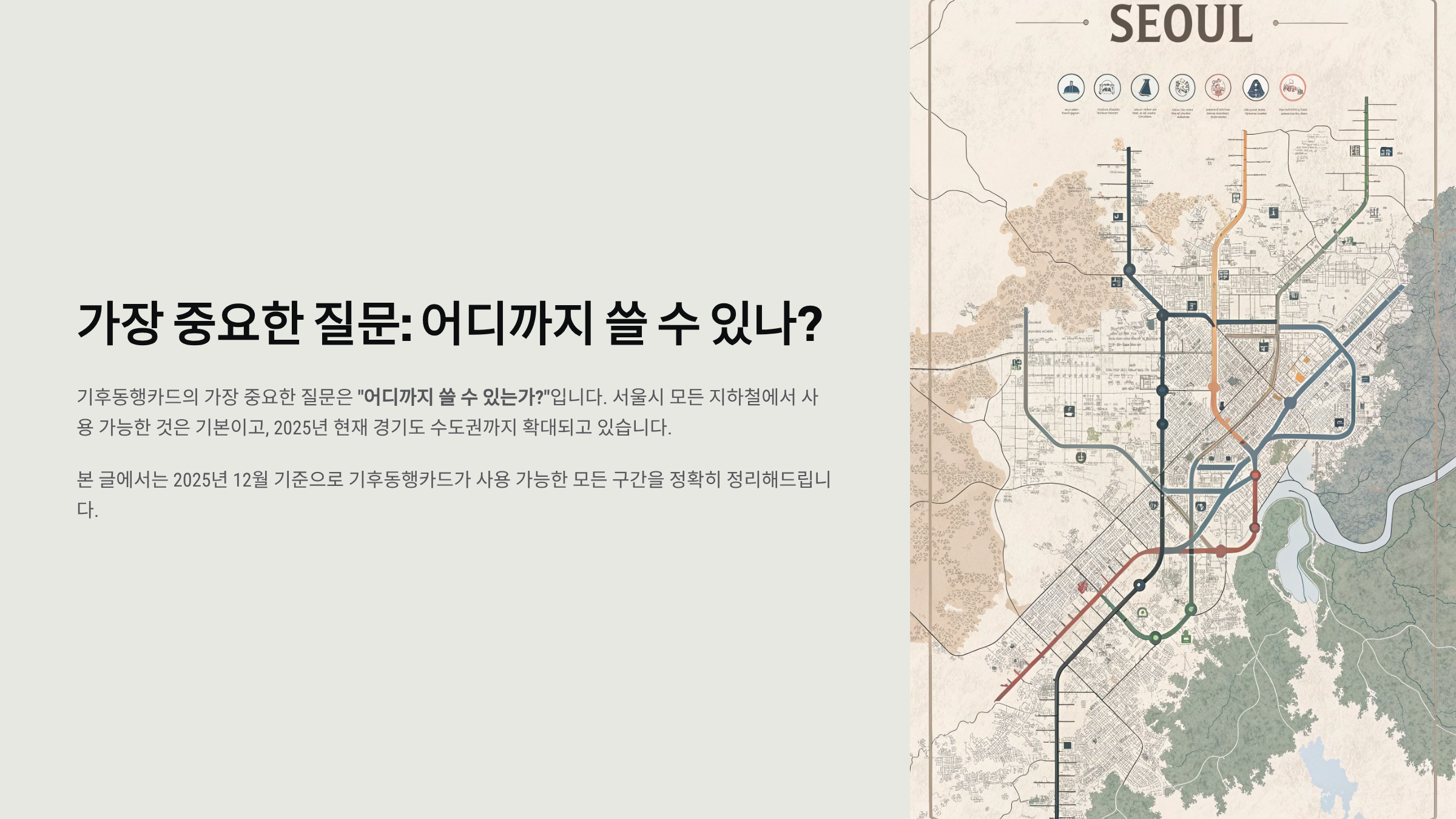 하지만 기후동행카드의 가장 중요한 질문은 "어디까지 쓸 수 있는가?" 다. 서울시 모든 지하철에서 사용 가능한 것은 기본이고, 2025년 현재 경기도 수도권까지 확대되고 있다. 본 글에서는 2025년 12월 기준으로 기후동행카드가 사용 가능한 모든 구간을 정확히 정리해드린다.