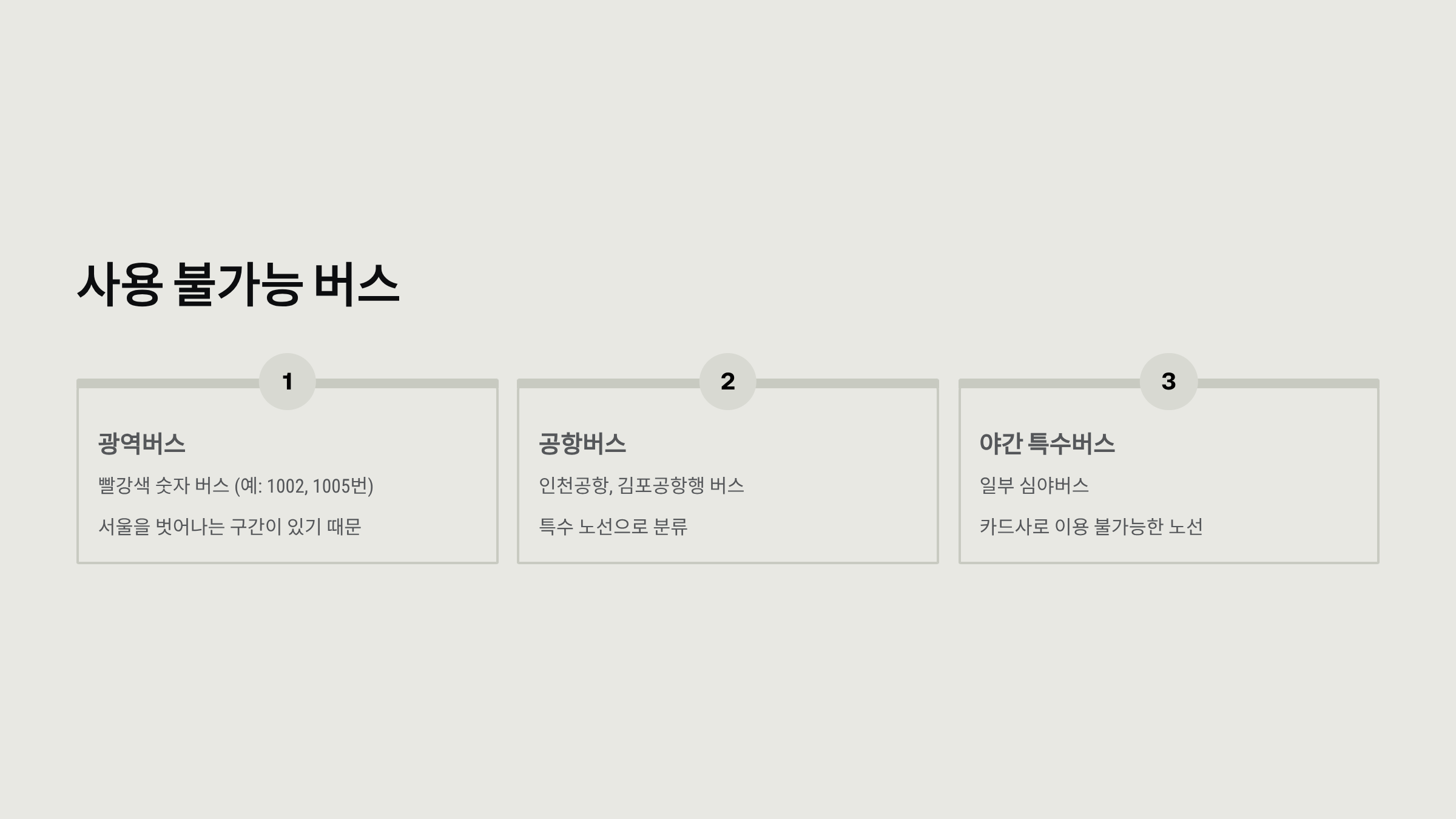 - 야간 특수버스: 일부 심야버스 (카드사로 이용 불가능한 노선)