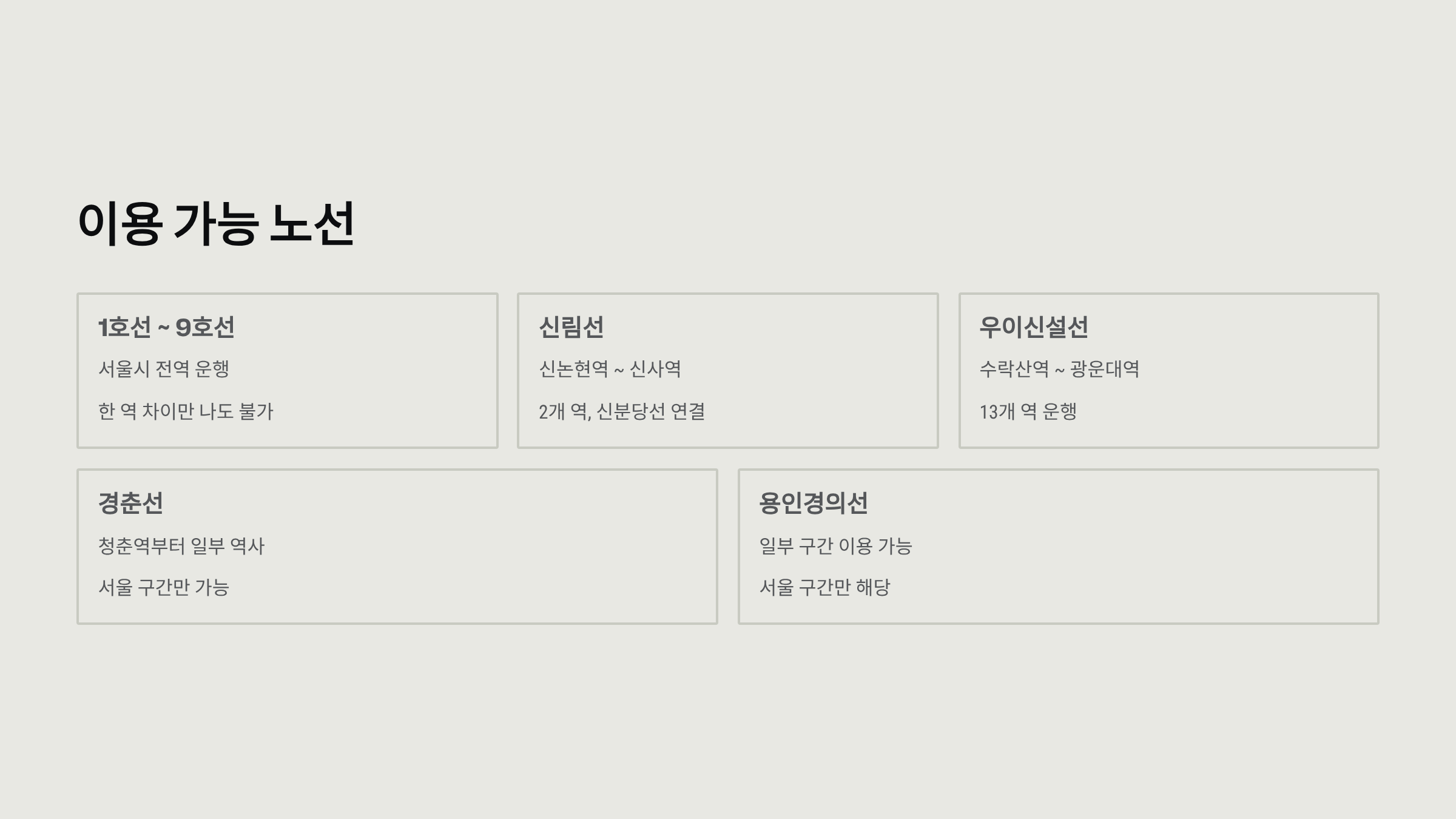 주의할 점: 서울 지하철이라도 경계를 넘는 구간은 불가다. 예를 들어, 1호선은 서울 관할 구간인 서울역~대사관역까지만 사용 가능하고, 천안 방향으로 가는 지역은 사용할 수 없다.