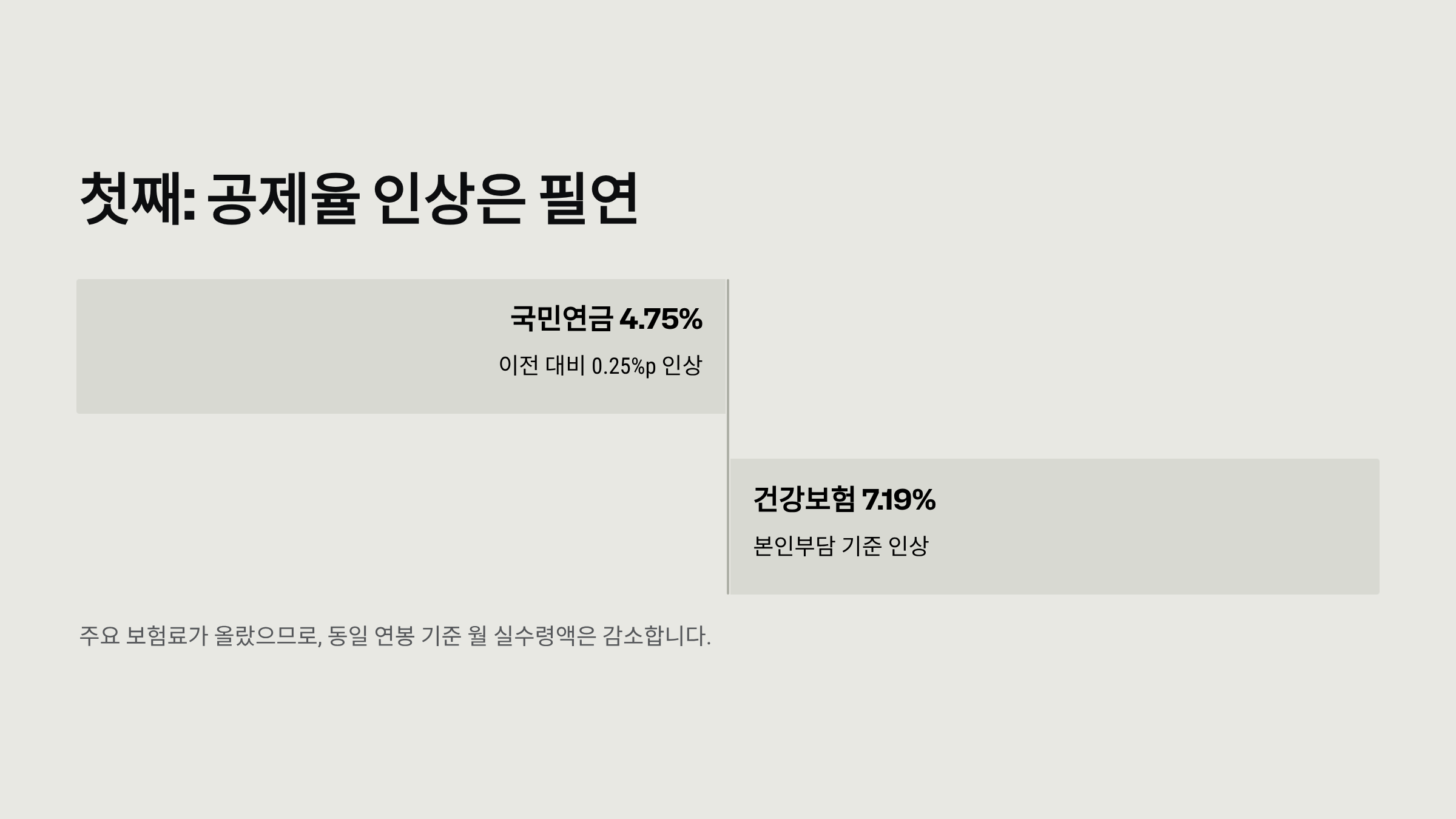 첫째, 공제율 인상은 피할 수 없습니다. 국민연금 4.75%, 건강보험 7.19% 등 주요 보험료가 올랐으므로, 동일 연봉 기준 월 실수령액은 감소합니다.