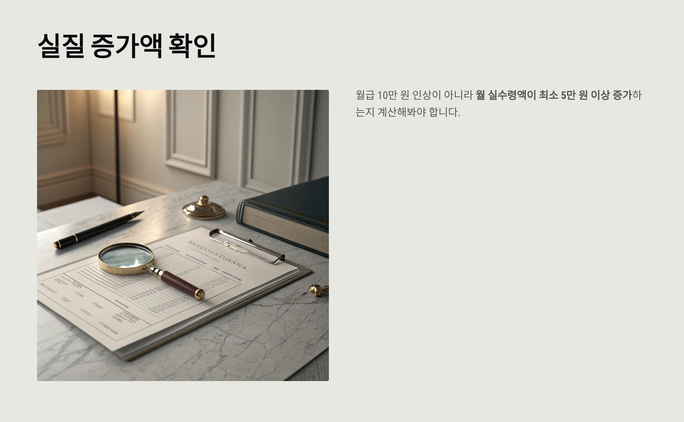 예를 들어, 월급 10만 원 인상이 아니라 월 실수령액이 최소 5만 원 이상 증가하는지 계산해봐야 합니다.