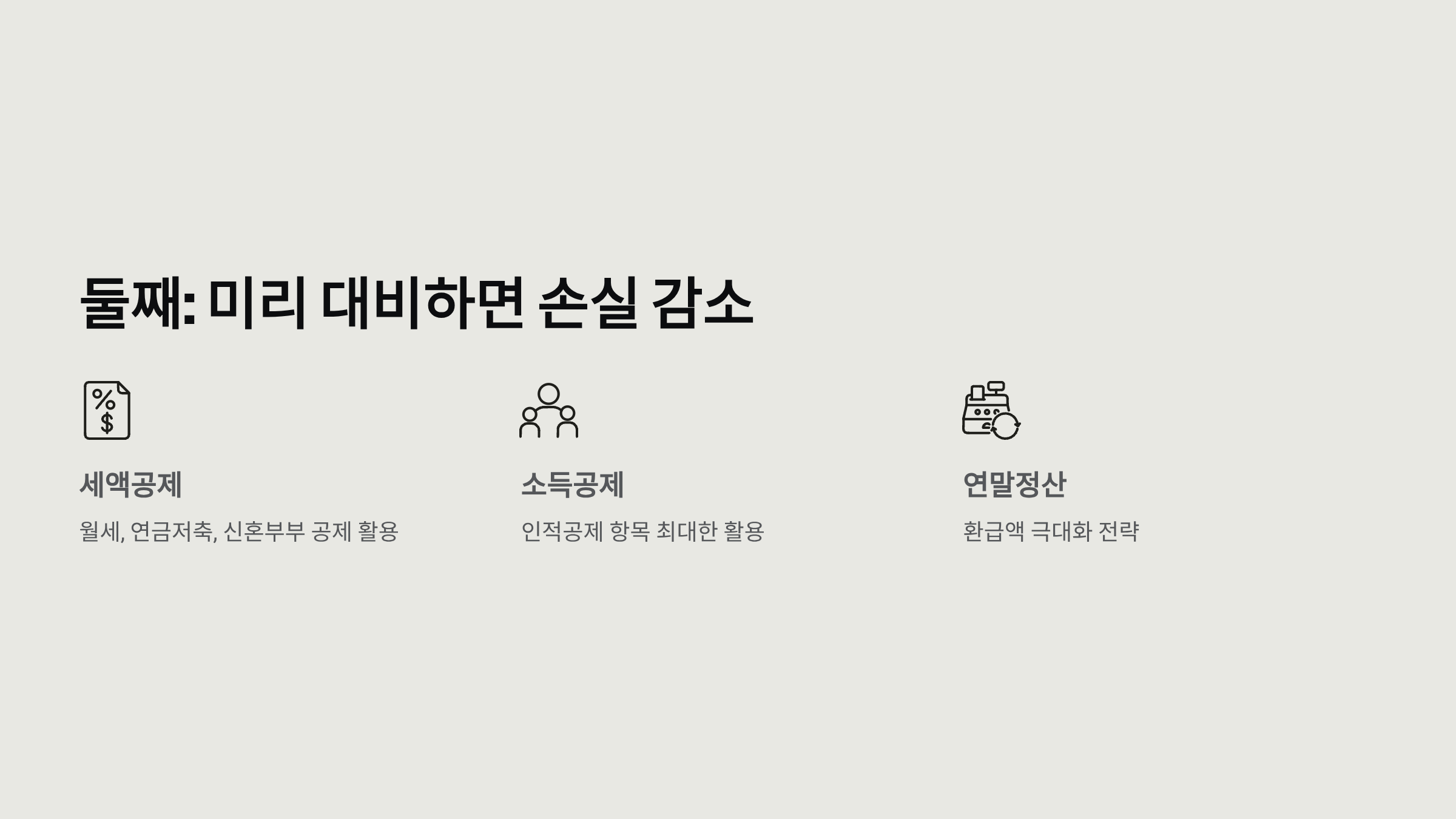 둘째, 미리 대비하면 손실을 줄일 수 있습니다. 세액공제와 소득공제 항목을 최대한 활용하면 연말정산에서 환급받을 수 있습니다. 특히 월세 세액공제, 연금저축, 신혼부부 공제 등을 놓치지 마세요.