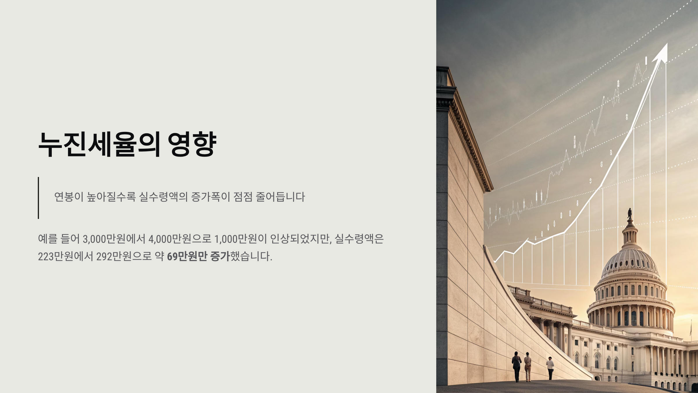 💡 표를 보면서 주목할 점: 연봉이 높아질수록 실수령액의 증가폭이 점점 줄어듭니다. 이는 누진세율이 적용되기 때문입니다. 예를 들어 3,000만원에서 4,000만원으로 1,000만원이 인상되었지만, 실수령액은 223만원에서 292만원으로 약 69만원만 증가했습니다.
