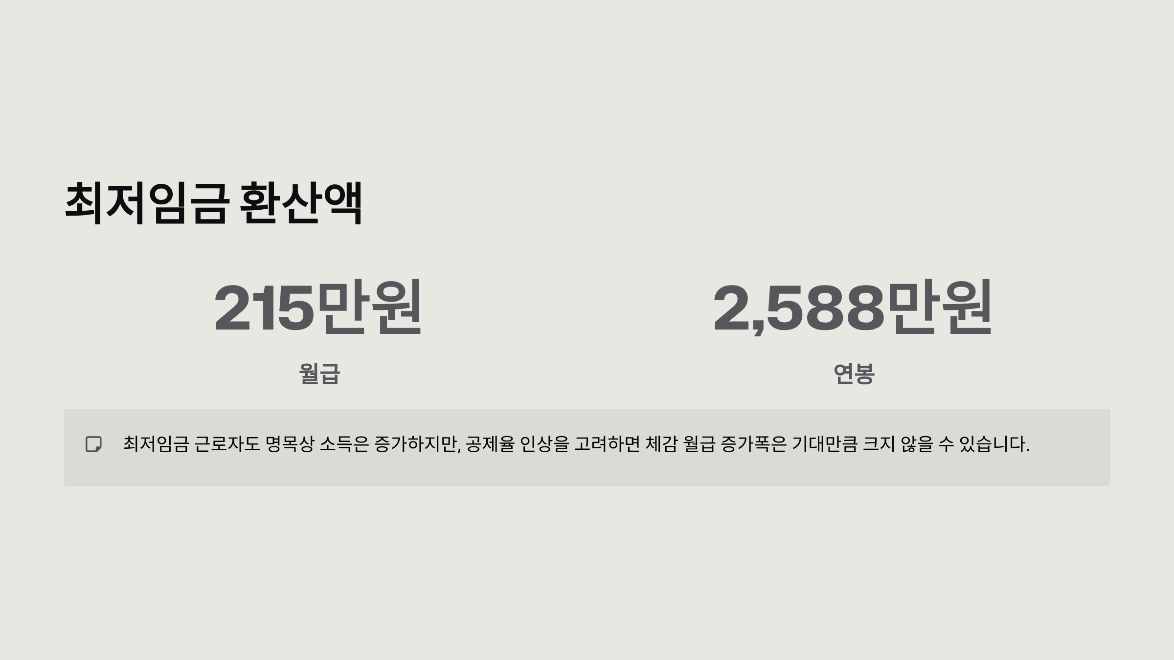이를 월급으로 환산하면 약 215만 원, 연봉으로는 약 2,588만 원 수준입니다. 최저임금 근로자도 명목상 소득은 증가하지만, 공제율 인상을 고려하면 체감 월급 증가폭은 기대만큼 크지 않을 수 있습니다.