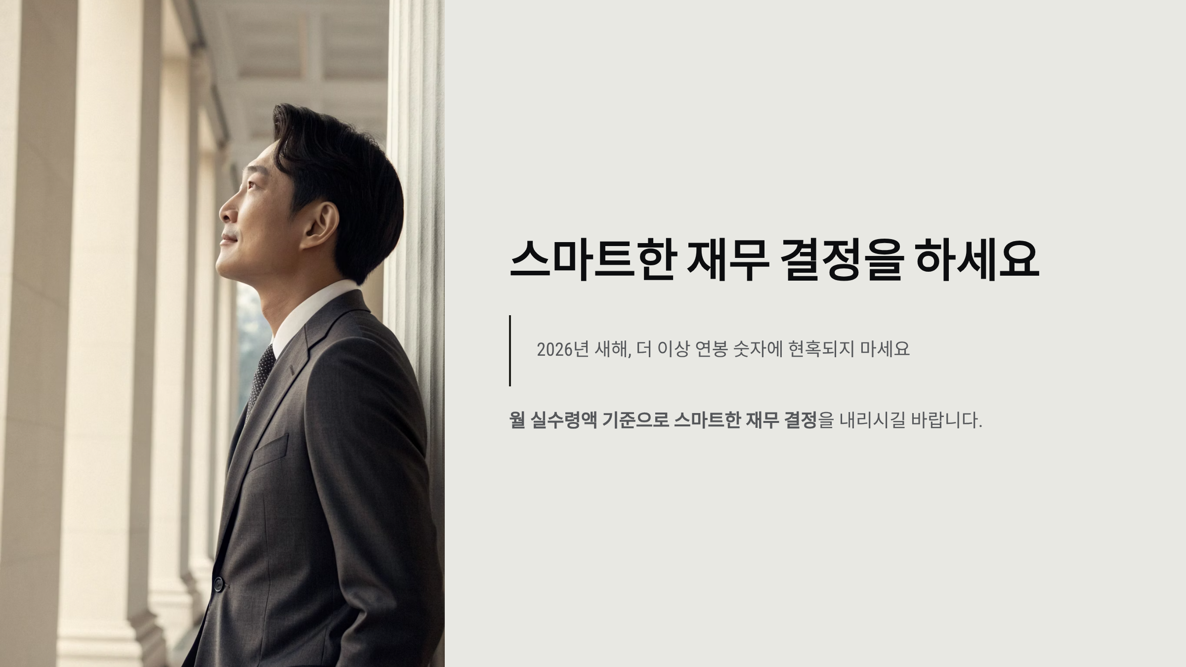 2026년 새해, 더 이상 연봉 숫자에 현혹되지 마세요. 월 실수령액 기준으로 스마트한 재무 결정을 내리시길 바랍니다.