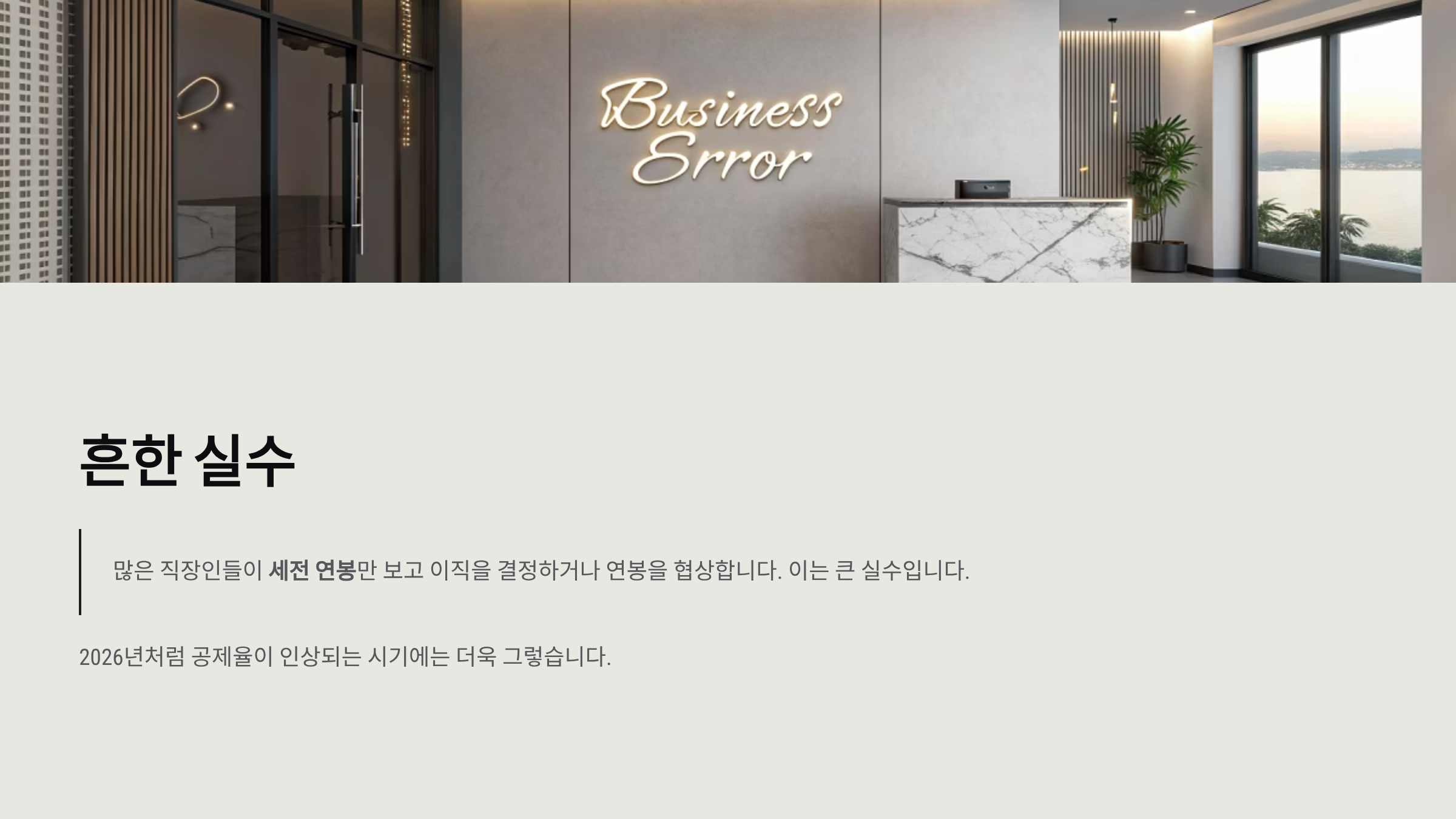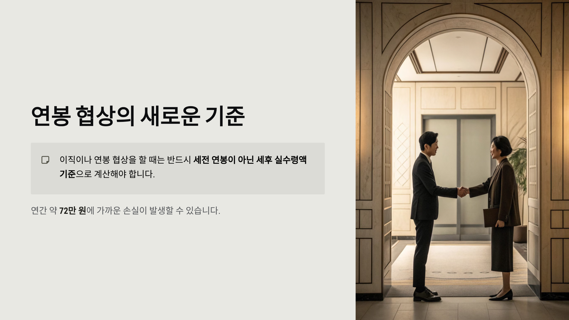 많은 직장인들이 세전 연봉만 보고 이직을 결정하거나 연봉을 협상합니다. 이는 큰 실수입니다. 2026년처럼 공제율이 인상되는 시기에는 더욱 그렇습니다.