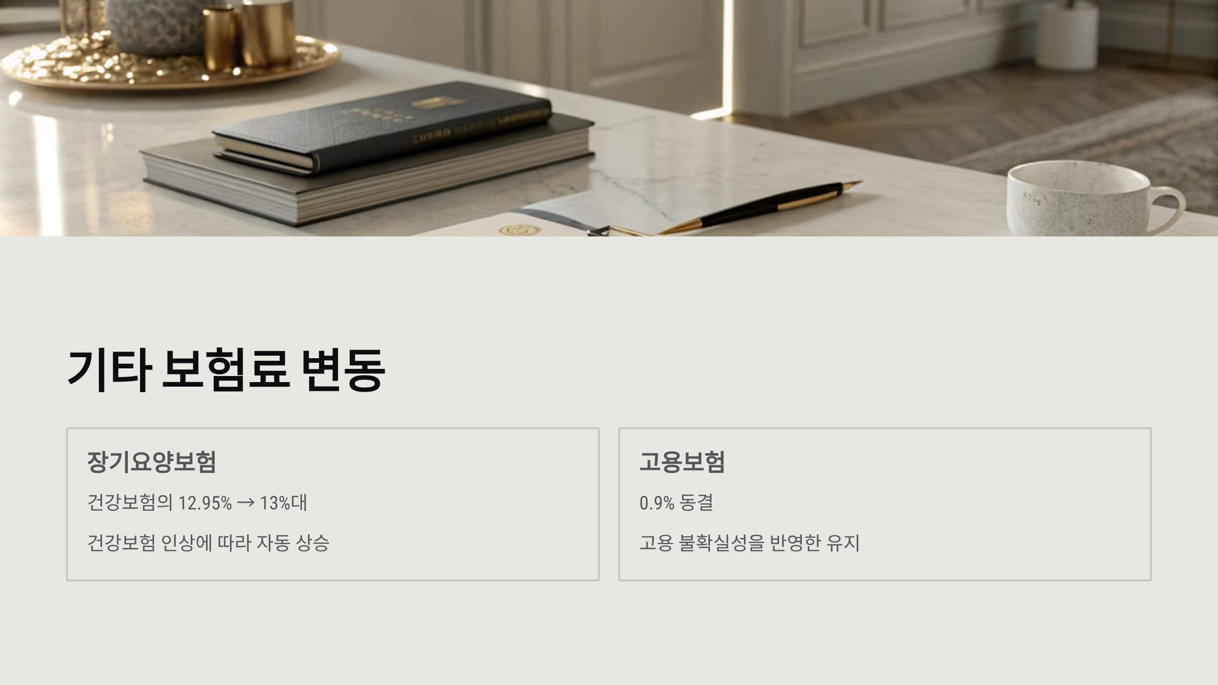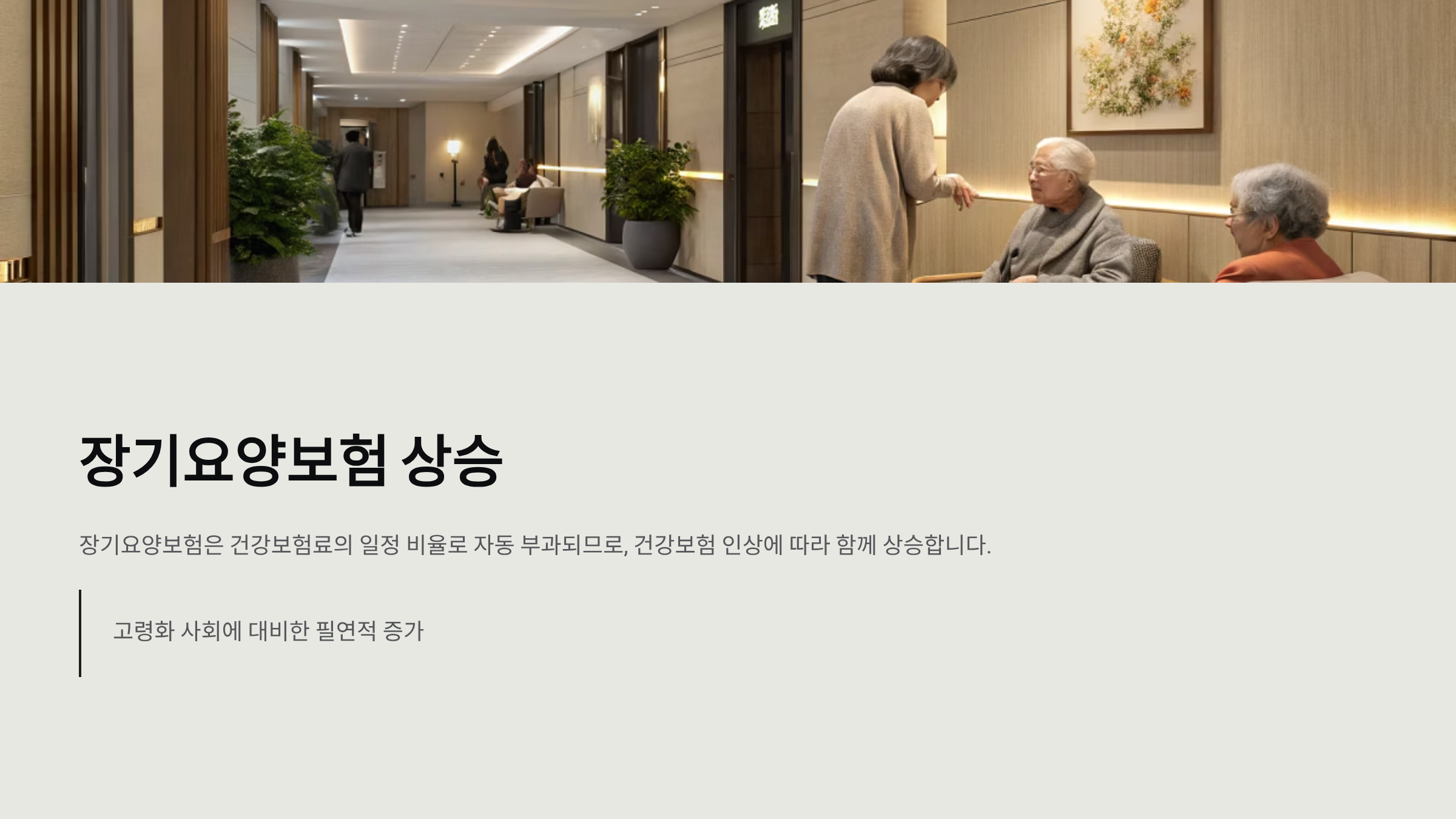 장기요양보험은 건강보험료의 일정 비율로 자동 부과되므로, 건강보험 인상에 따라 함께 상승합니다. 고령화 사회에 대비한 필연적 증가라고 할 수 있습니다.