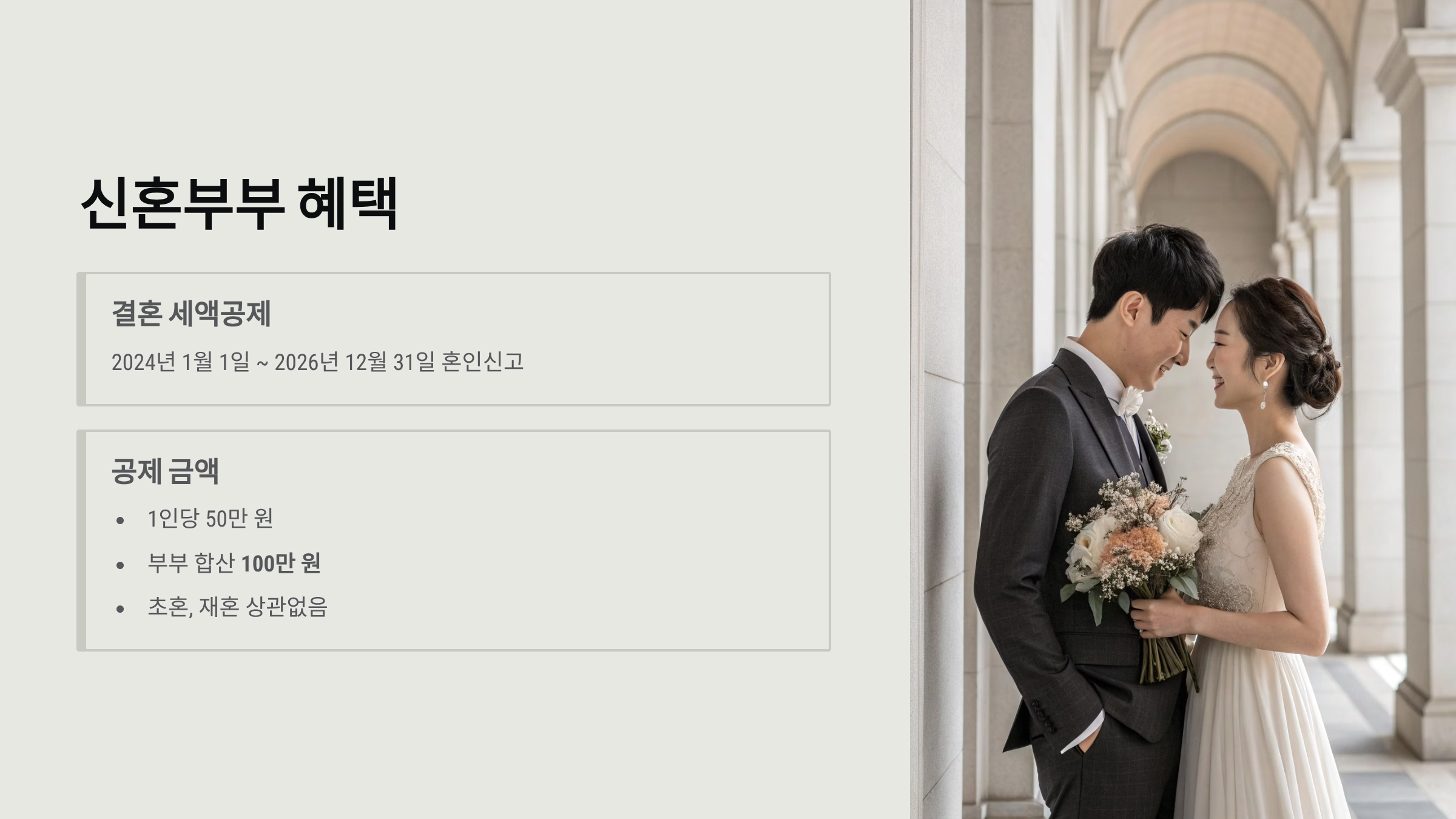 2024년 1월 1일부터 2026년 12월 31일까지 혼인신고한 부부라면 1인당 50만 원, 부부 합산 100만 원의 세액공제를 받을 수 있습니다. 초혼, 재혼 상관없으니 꼭 챙기세요.